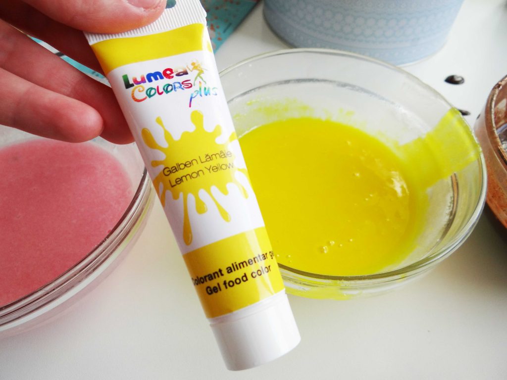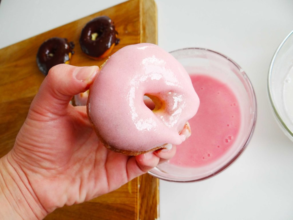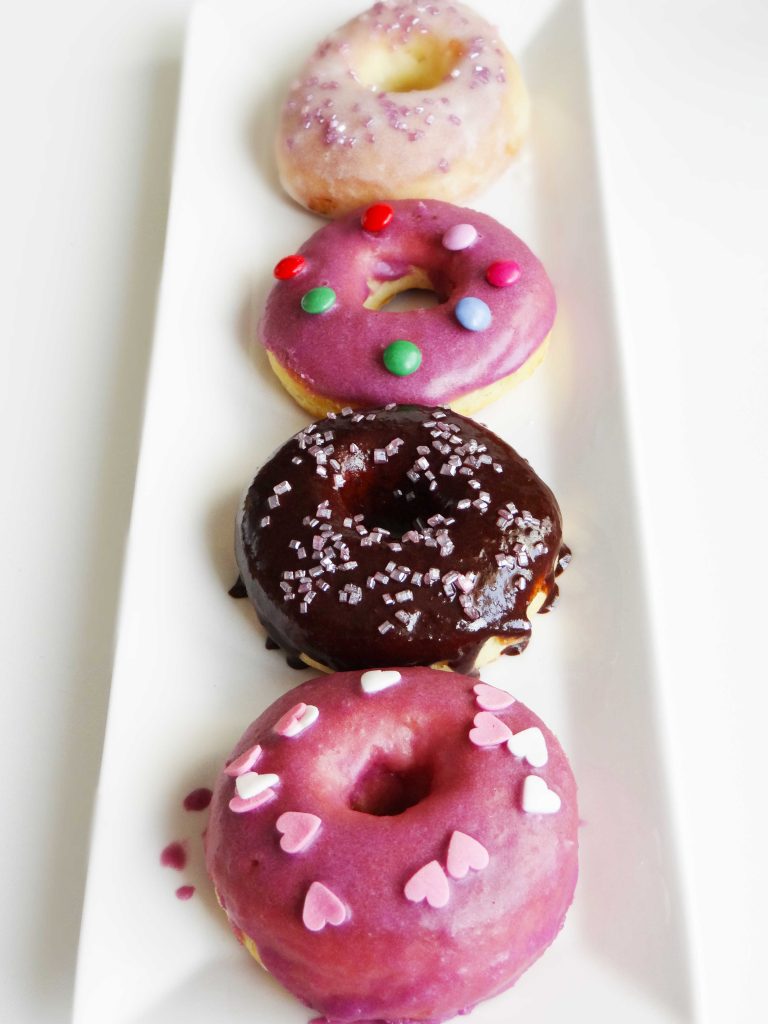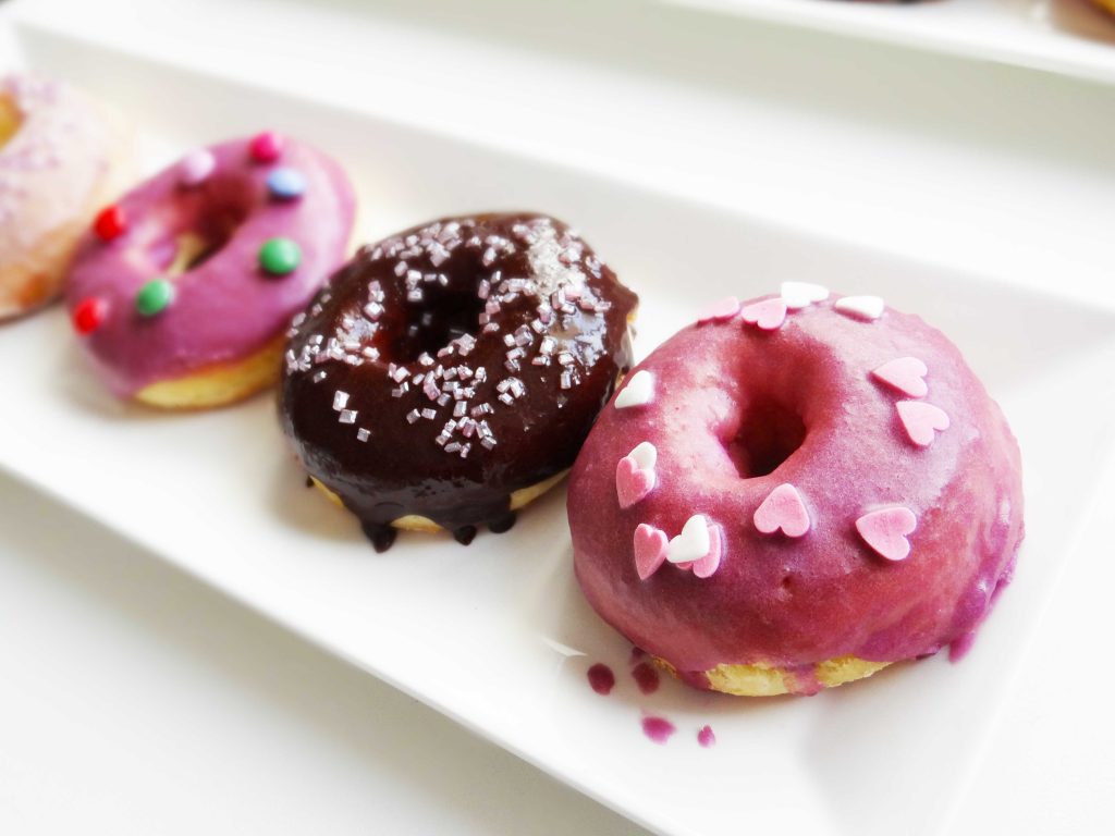 După ce am glazurat câteva gogoși cu glazura de culoare albă și roz am transformat glazura albă într-una galbenă și pe cea roz într-una mov.