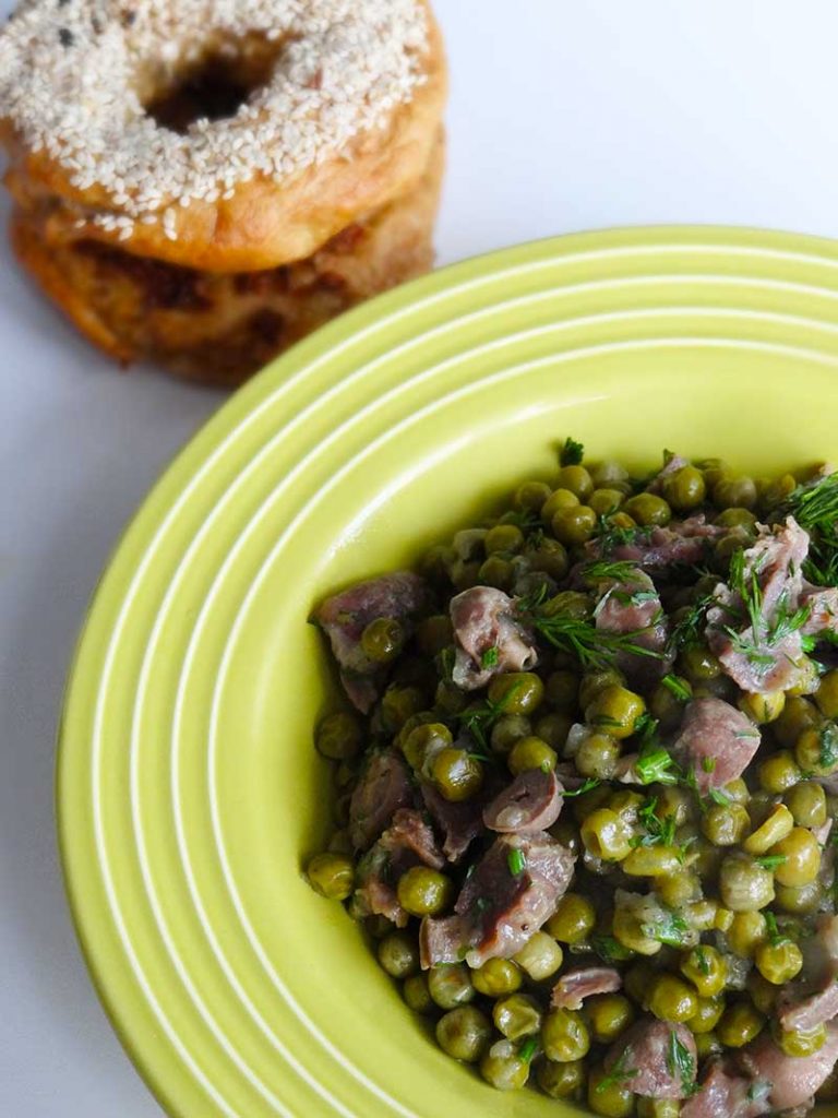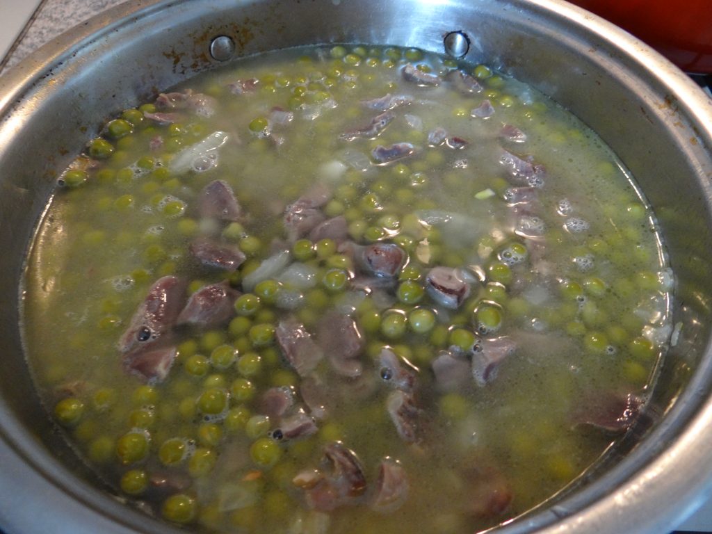 3. Călim ceapa după care adăugăm inimile și pipotele și le călim și pe acestea 2-3 minute. După adăugăm mazărea, 1/2 linguriță sare și 1/4 linguriță piper măcinat. Adăugăm apă cât să acopere totul și le lăsăm să fiarbă până când mazărea este făcută.