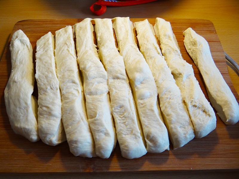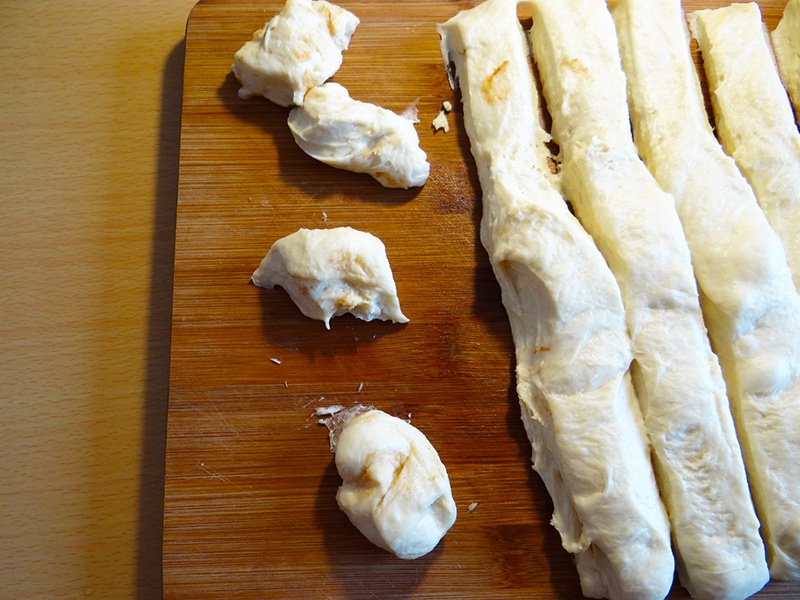 Fiecare fasie o taiem in bucatele mici cat o caisa.