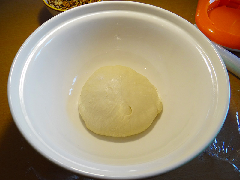 8. Punem aluatul intr-un castron uns cu ulei, il acoperim cu folie de bucatarie si cu un servet, pentru a ne asigura ca aerul nu iese din castron. Il lasam la loc cald pentru 2 ore, cat sa-si dubleze volumul