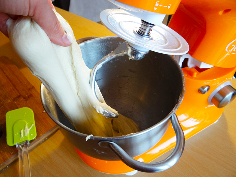 7. Dupa 10 minute aluatul arata asa. Trebuie sa fie elastic, cand tragi de el sa sa intinda