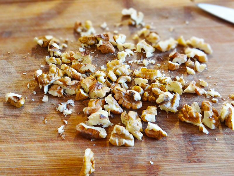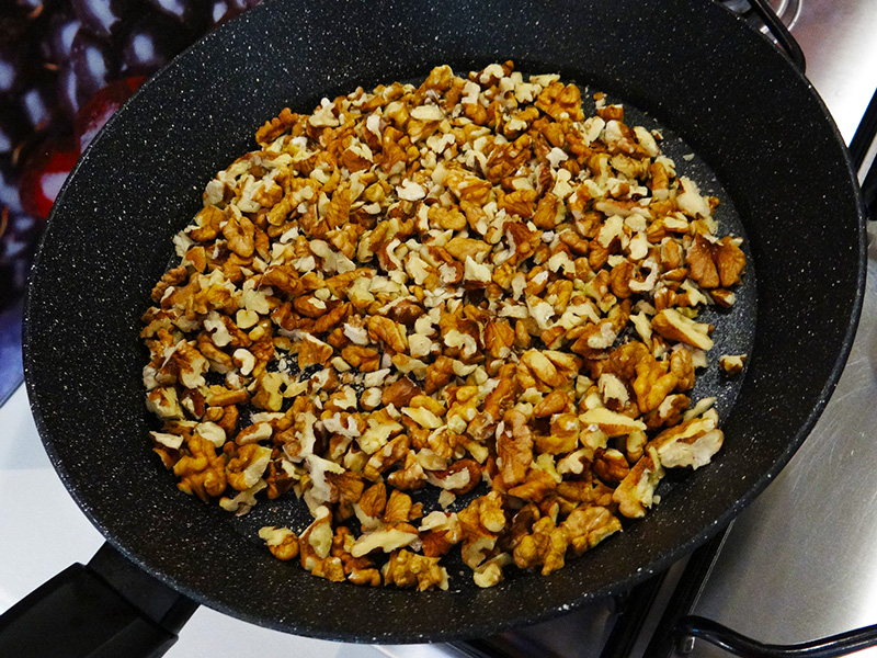 Acum ca am terminat cu aluatul trebuie sa ne ocupam de nuci, adica sa le taiem in bucati mari si sa le prajim.