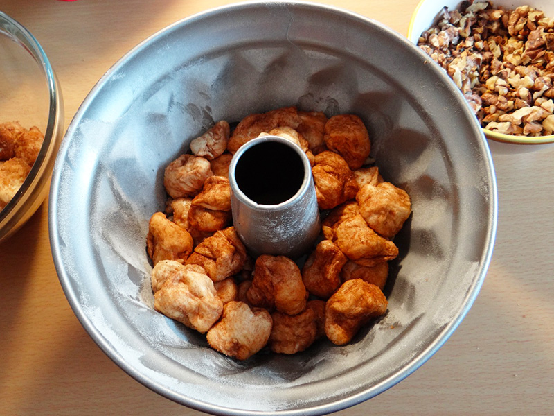 5. Punem ultimul strat de gogosele, restul de sos caramel si de nuci