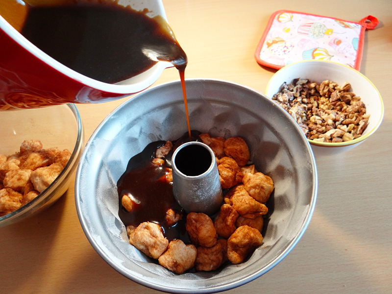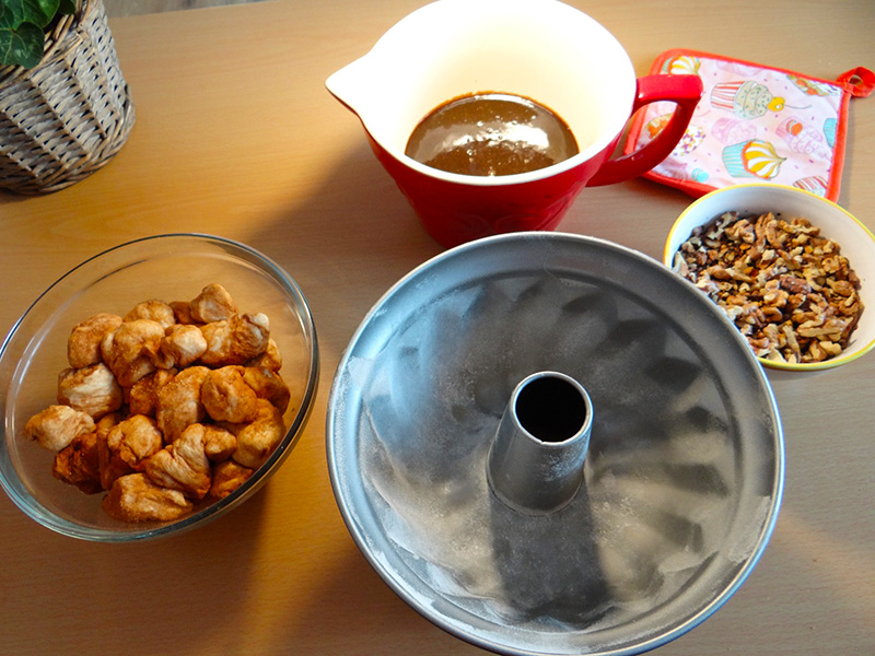 Acum urmeaza asamblarea aluatului, nucilor si sosului caramel in forma de copt. Forma mea are o gaura in mijloc, daca nu aveti o forma de acest fel puteti folosi una rotunda pentru tort.