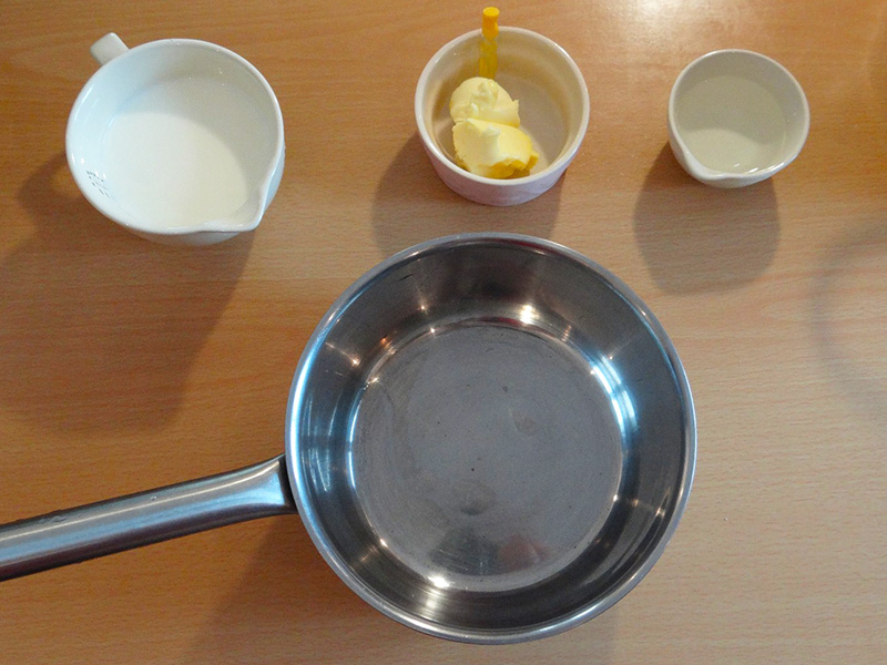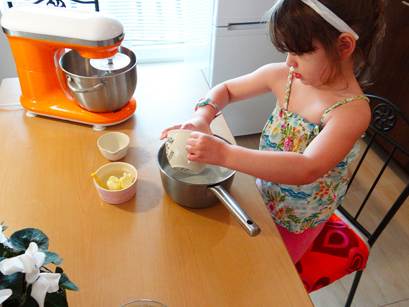 4. Punem ingredientele lichide intr-o craticioara- laptele, apa,vanilia impreuna cu untul