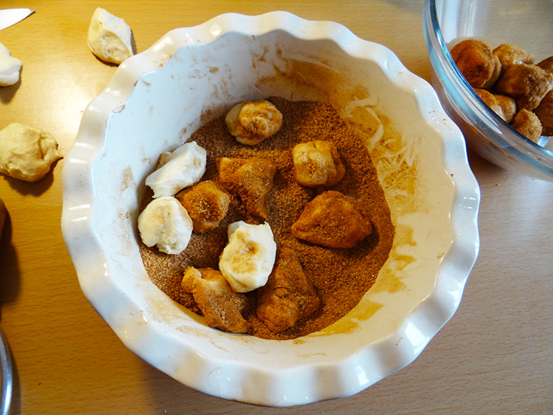 Si apoi le punem in castronul cu zahar si scortisoara, si le tavalim bine.
