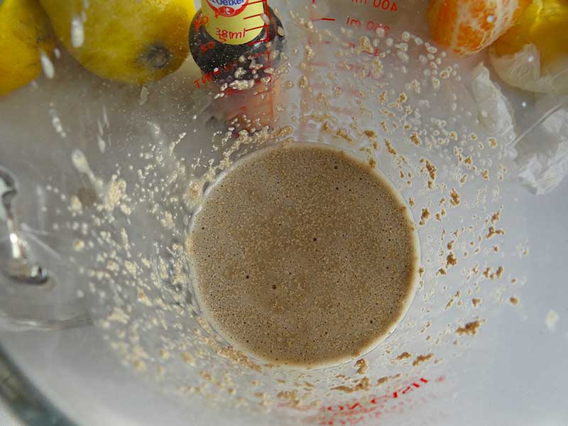 1. Prima dată trebuie să activăm drojdia și pentru a face acest lucru amestecăm drojdia uscată cu 2 linguri de zahăr și cu jumătate din cantitatea de lapte călduț. Lăsăm amestecul 10 minute într-un loc cald.