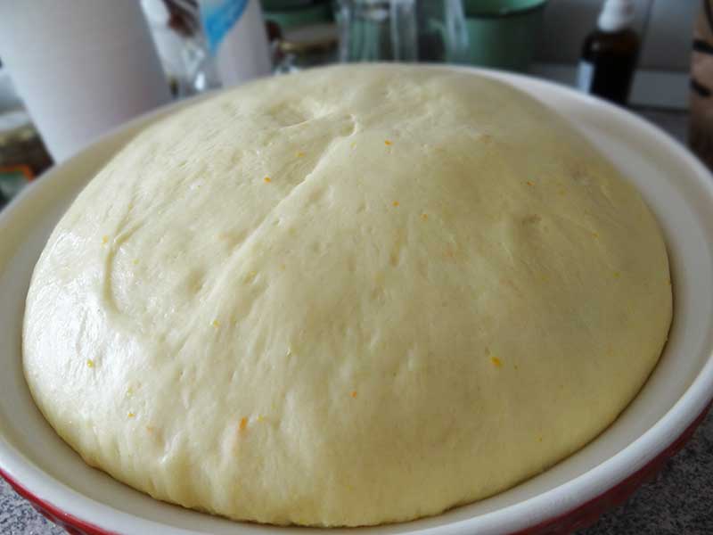 Și așa arată după ce a crescut în jur de o oră jumate. Pentru a fi sigură că voi obține un aluat ca cel din imagine pornesc un ochi de la aragaz iar aluatul îl pun lângă acesta, într-un castron acoperit cu folie de plastic.