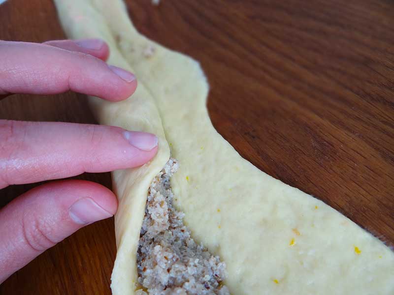 5. După ce aluatul a crescut îl împărțim în 15 porții egale(în jur de 125g). Luăm câte o bucată și îi dăm o formă de sul cu dimensiunea de 35-40cm. Apoi o aplatizăm și cu ajutorul unui sucitor o întindem bine. Punem umplutură pe toată lungimea acesteia după care rulăm. La rulat trebuie să aveți grijă să luați marginea dinspre voi și să o rulați peste umplutură și apoi o introduceți un pic sub aceasta, în acest fel vă asigurați că umplutura nu iese. Vă spun asta deoarece eu am pățit-o când eram mai mică și mai nepricepută.