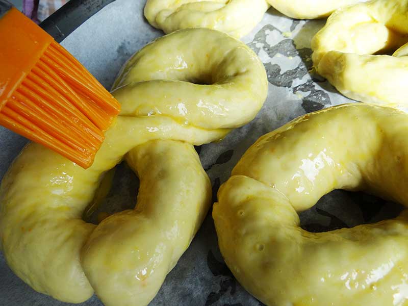7. După ce au crescut mucenicii îi ungem cu ou bătut(am folosit 2 ouă care și acestea trebuie să fie la temperatura camerei) și îi coacem până devin arămii, cam 15-16 minute în cazul cuptorului cu convecție.