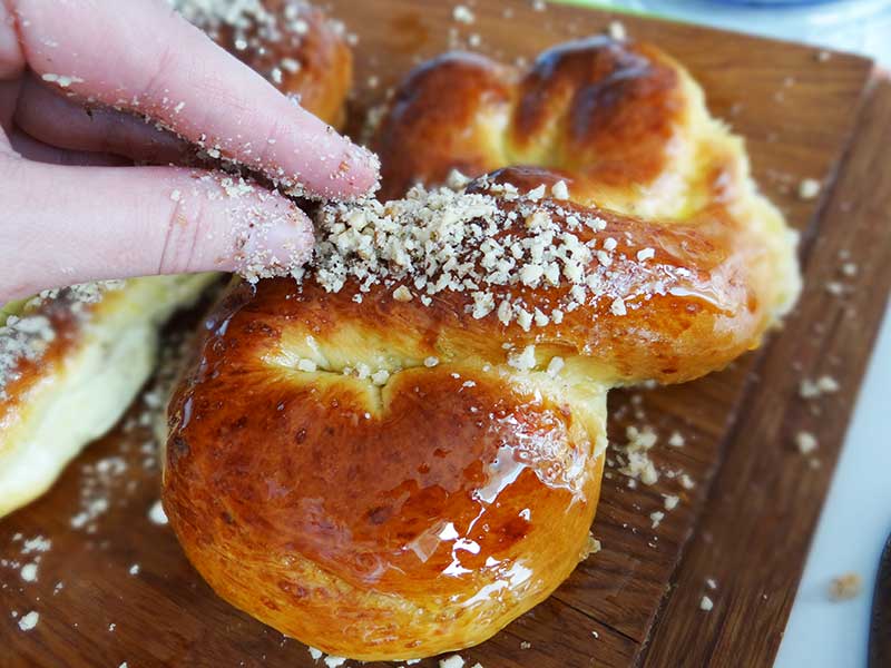 9. După ce scoatem mucenicii din cuptor îi lăsăm 2-3 minute să se răcească după care îi trecem prin siropul fierbinte. Îi mai lăsăm la răcit 3 minute după care îi ungem cu miere și îi presărăm cu nucă măcinată.