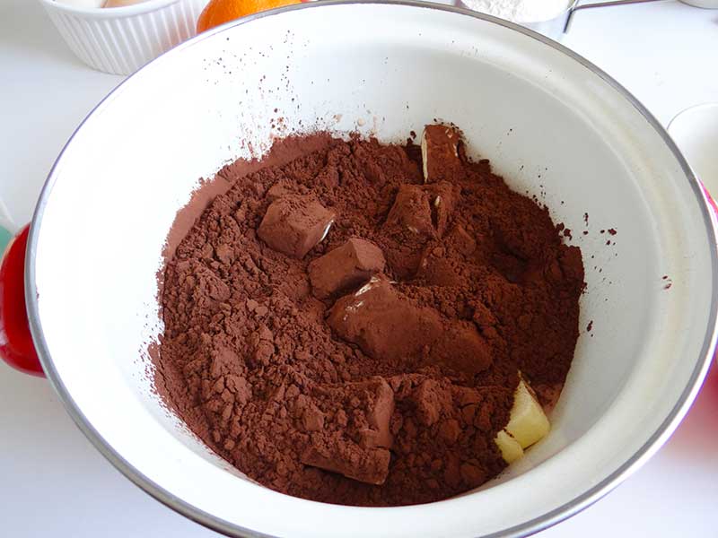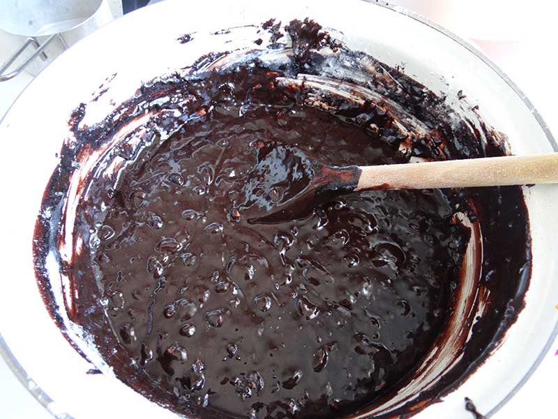 1. Punem pe foc laptele împreună cu untul, zahărul și cacaoa cernută. Focul trebuie să fie mic iar crăticioara pe care o folosiți să aibă fundul gros. Ținem totul pe foc până când compoziția capătă consistența unei smântâni iar zahărul este topit complet. Din acestă cremă punem deoparte 10 linguri pe care le vom folosi la glazurat.
