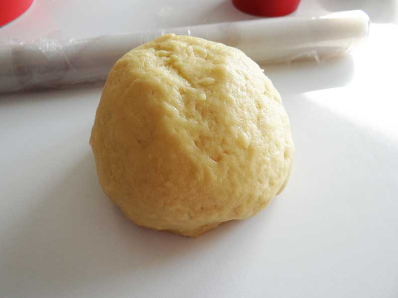 3. Adăugăm făina treptat și frământăm până când obținem un aluat ferm și nelipicios. Aluatul astfel obținut îl învelim în folie de plastic și îl dăm la frigider cât pregătim crema.