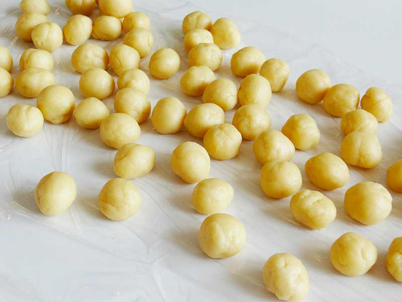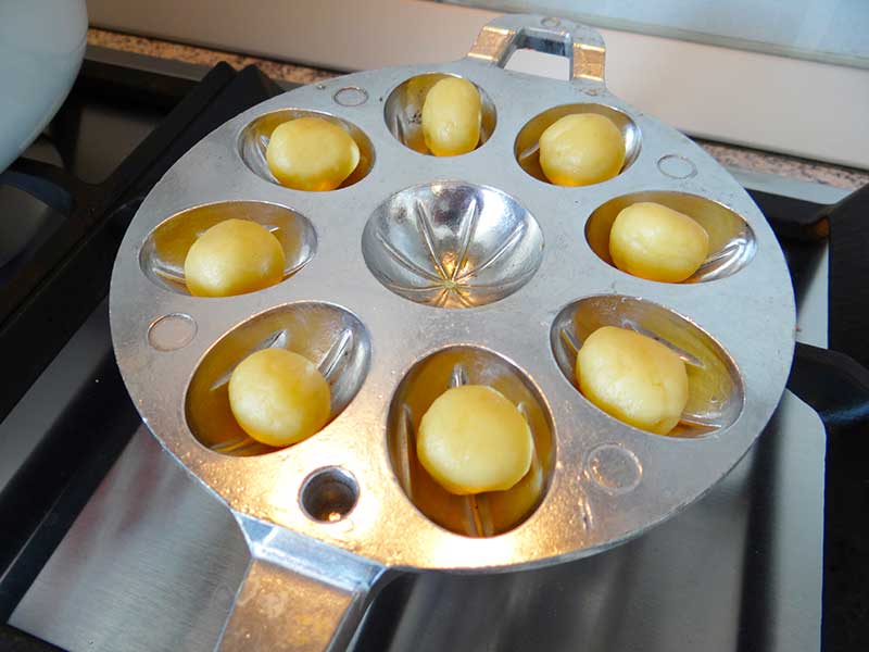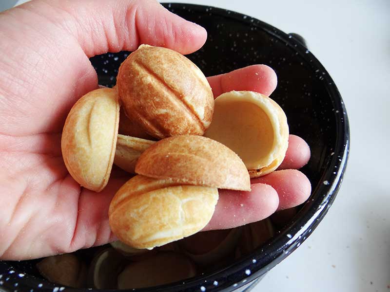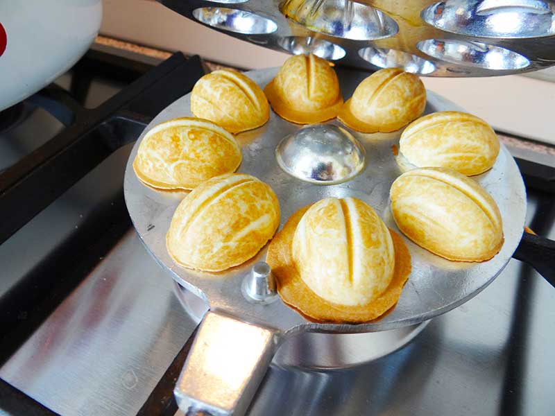5. Pentru a forma cojile de nuci, luăm bucăți de 5-6g din aluat și formăm biluțe. Punem la încins forma specială pentru nuci, așezăm în fiecare adâncitură câte o biluță după care închidem forma și ținem mânerul strân cu putere. Lăsăm forma pe foc câteva secunde după care o întoarcem și o mai lăsăm câteva secunde(10-20).