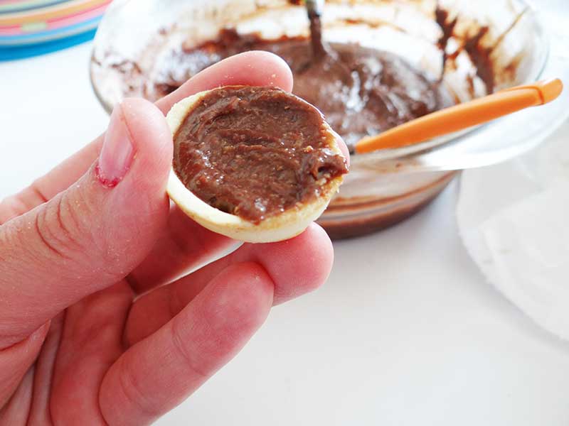 7. Umplem nucile cu ajutorul unei lingurițe după care le lipim două câte două. La final le pudrăm cu zahăr pudră.