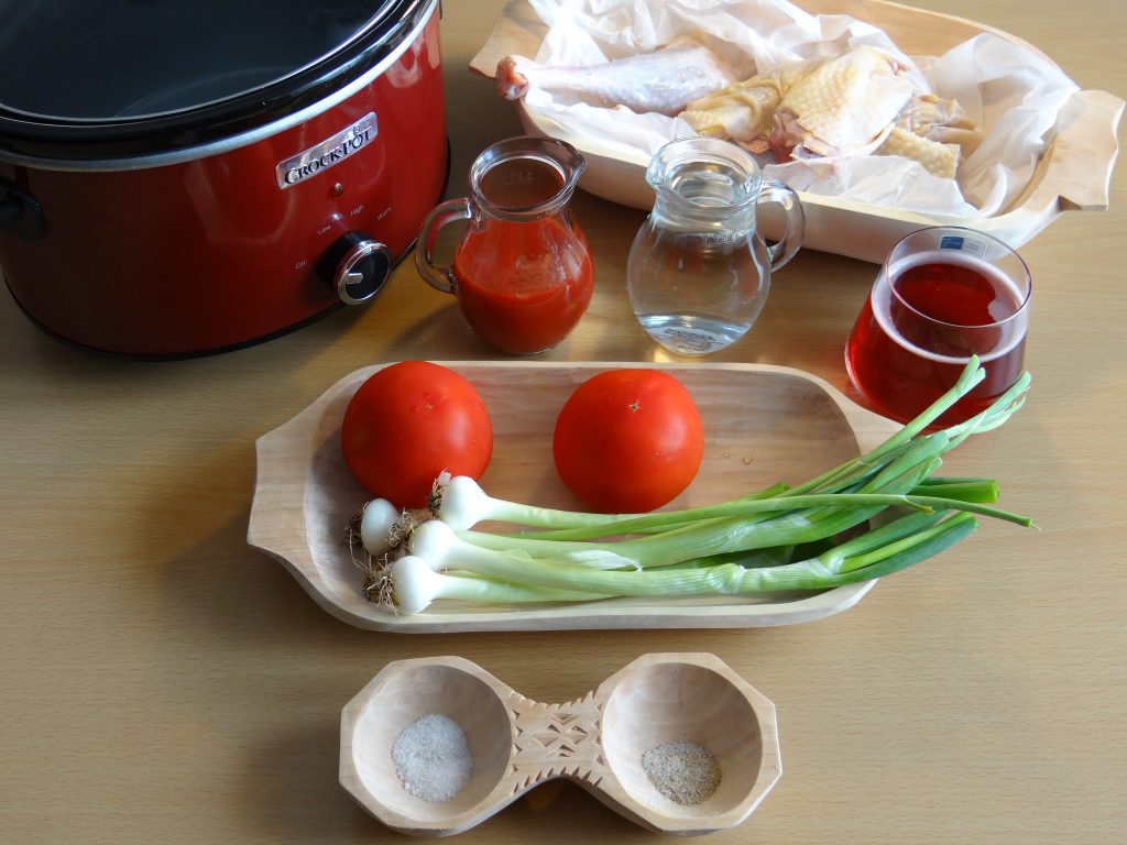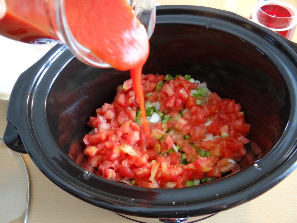 3. Așezăm carnea în Crock-pot după care adăugăm ceapa și usturoiul, sucul de roșii, apa, vinul, roșiile tăiate. Asezonăm cu sare și piper. Setăm funcția High și gătim totul în jur de 3 ore sau până când carnea se desprinde de pe os.