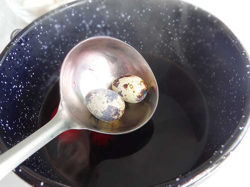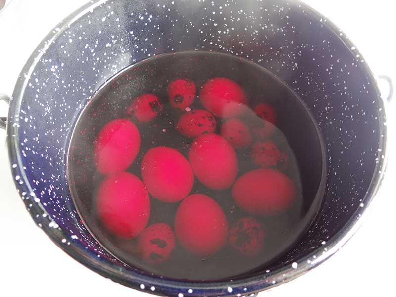 3. Ținem oăle în această soluție între 2 și 4 minute, în funcție de cât de intensă vrem să fie culoarea ouălor. Scoatem oăle pe hârtie de bucătărie și le lăsăm la uscat.
