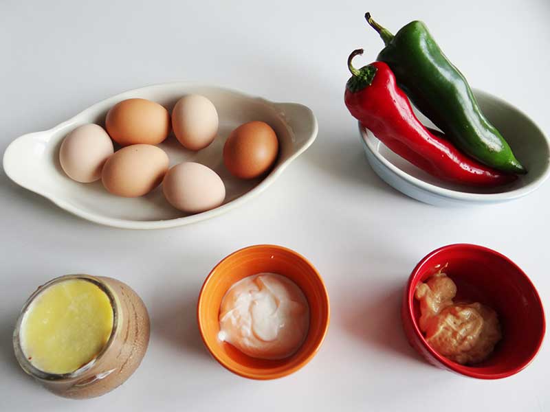 5. Decorăm fiecare ou umplut cu cubulețe de ardei roșu și verde.