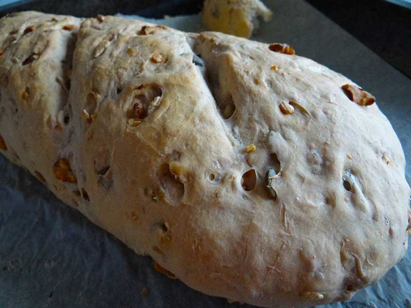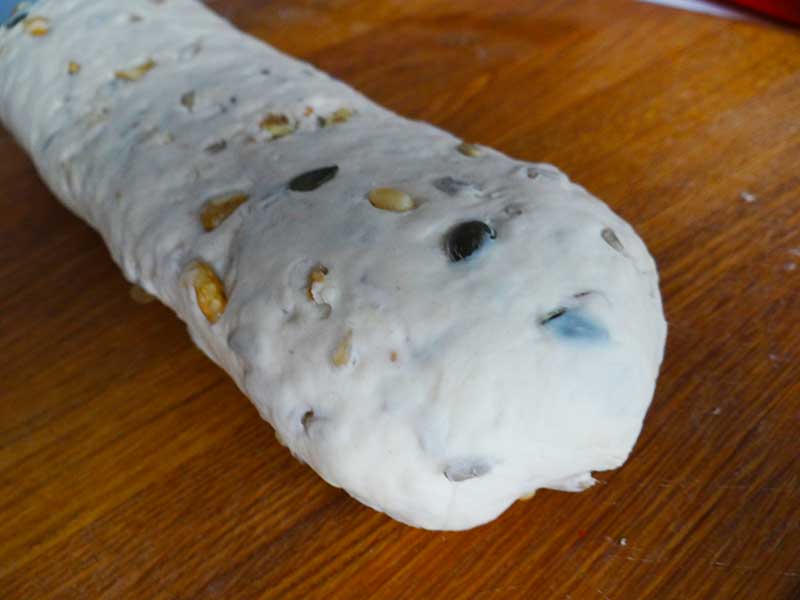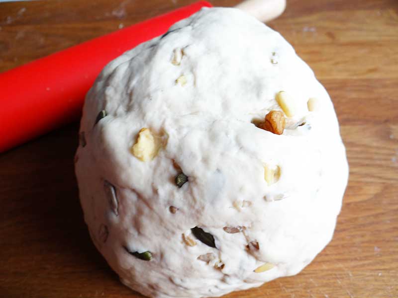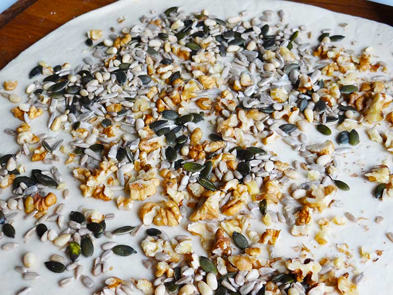 4. Ungem planul de lucru cu puțin ulei apoi așezăm aluatul pe care îl mai frământăm 2 minute. Cu ajutorul unui sucitor întindem aluatul astfel încât să obținem o foaie subțire. Presărăm nucile și semințele și apoi mai frământăm 2 minute. Punem aluatul la dospit astfel încât să-și dubleze volumul.