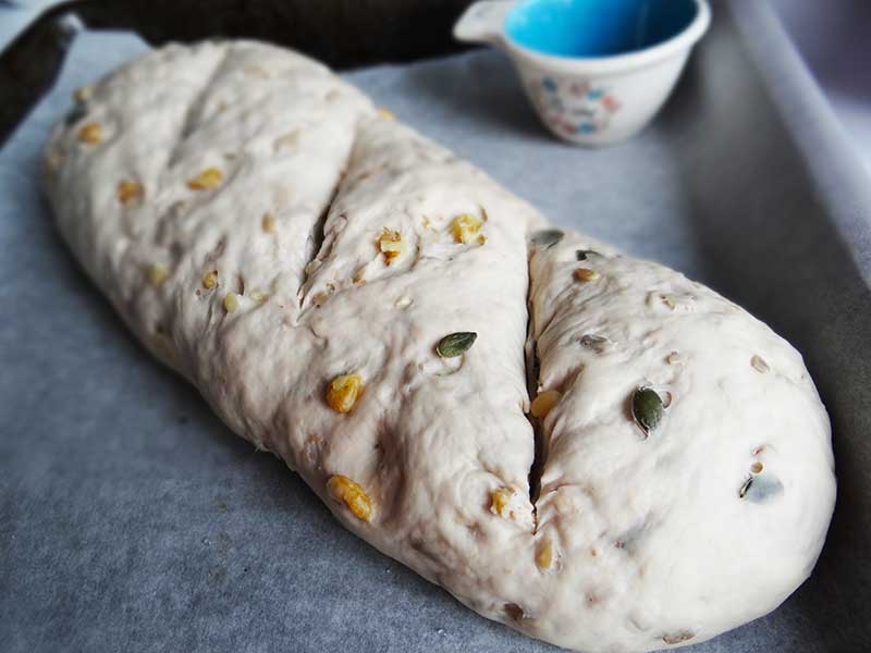 8. Punem pâinea într-o tavă tapetată cu hârtie de copt după care o acoperim cu o folie de plastic. Lăsăm pâinea la dospit 30 de minute.