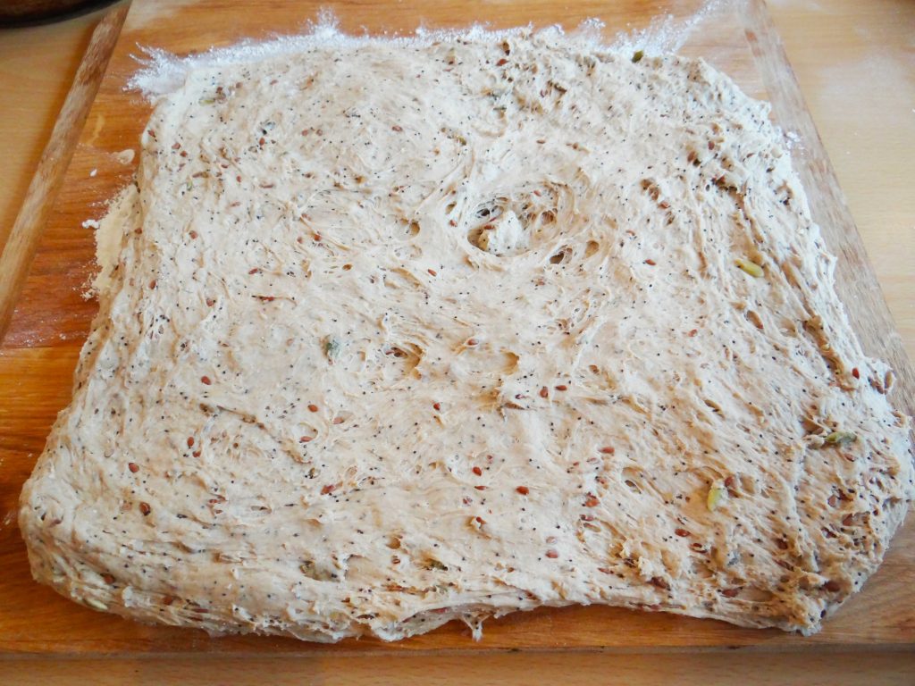 6. Punem aluatul pe masa de lucru înfăinată și îi dăm o formă dreptunghiulară.(îl întindem ușor cu ajutorul palmelor).