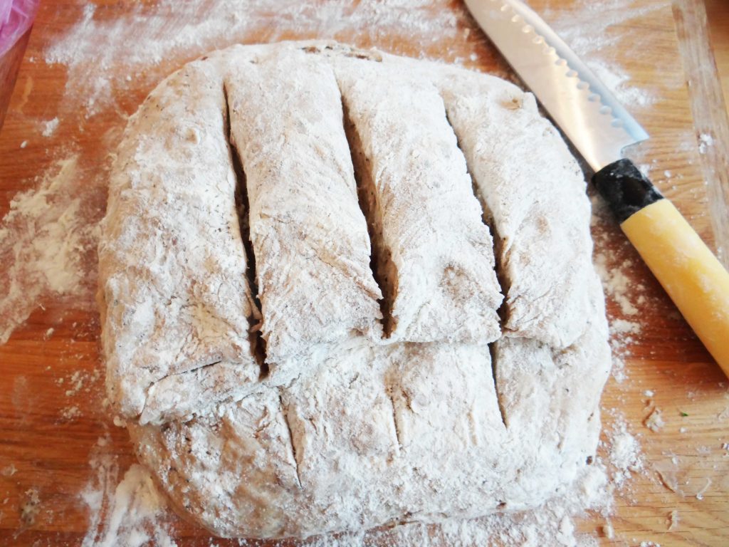 10. După ce a trecut o oră acoperim aluatul cu o cantitate generoasă de făină și cu un cuțit bine ascuțit facem 3 crestaturi adânci.