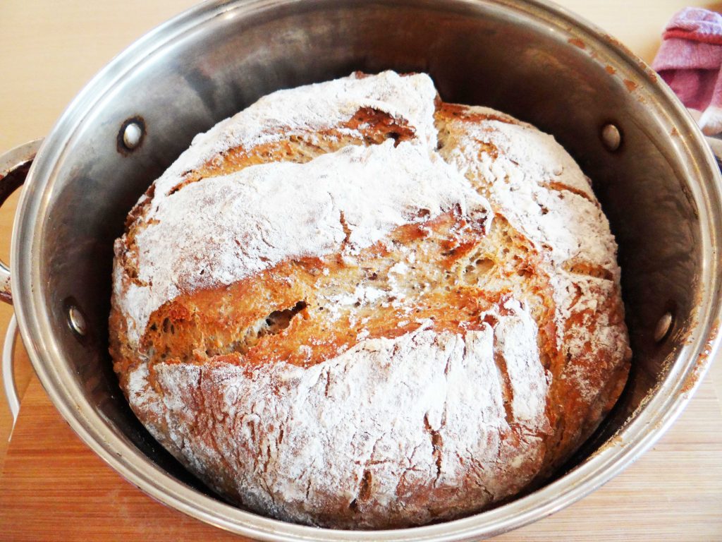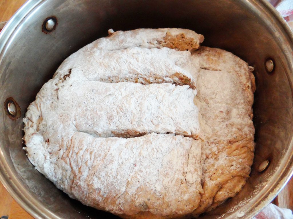 Scoatem pâinea din oală și o lăsăm la racit pe un grătar/tocător de lemn.