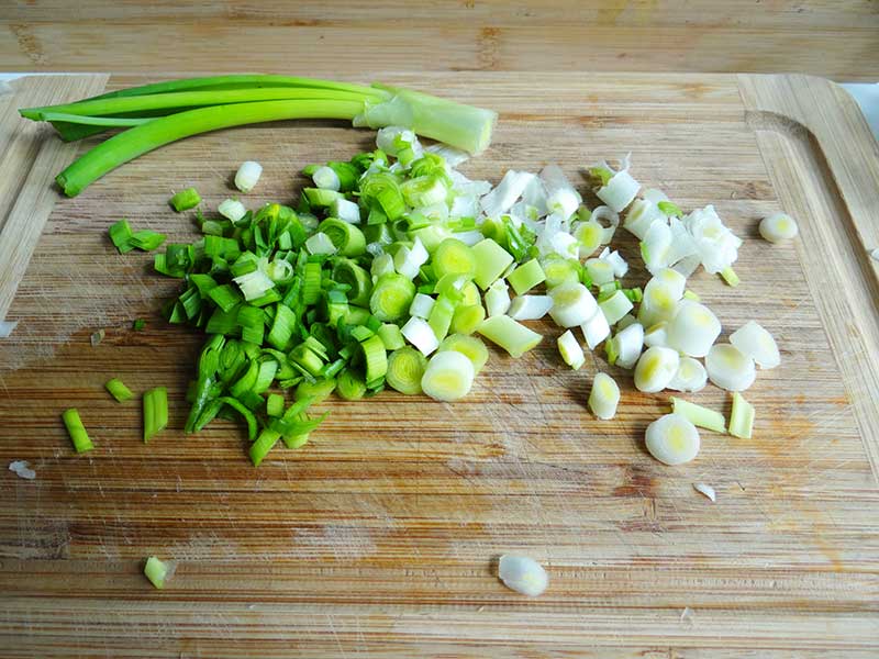 2. Tocăm ceapa galbenă, ceapa și usturoiul verde.