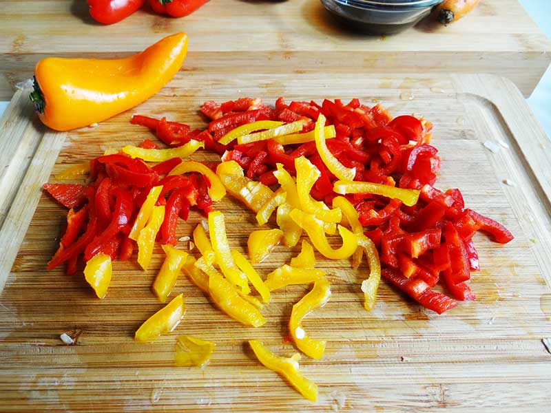 7. Adăugăm varza, ardeiul și morcovul. Le călim și pe acestea până se înmoaie ușor. Adăugăm oțetul de orez și sos de soia după gust și legumele noastre sunt gata.