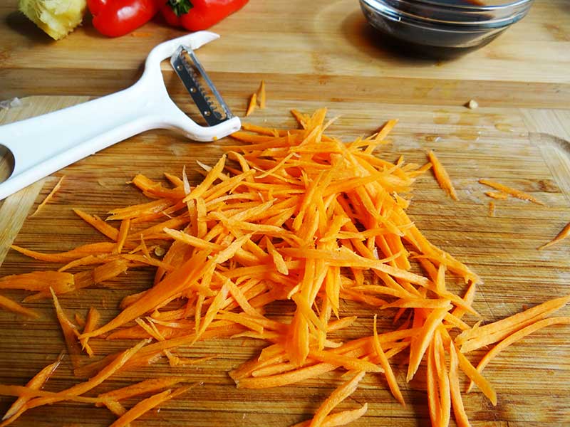 5. Tăiem morcovul în felii subțiri. Eu am folosit o ustensilă specială cu ajutorul căreia am tăiat morcovul rapid în fâșii foarte subțiri.