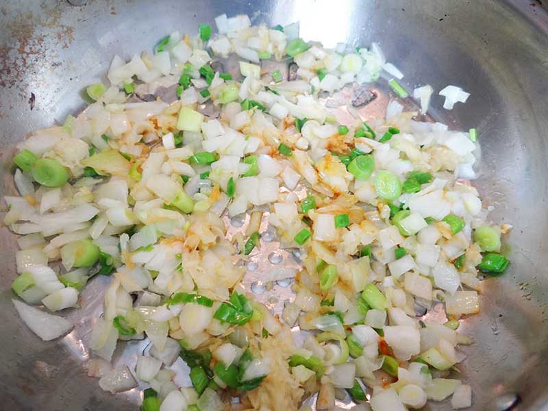 5. Punem uleiul la încins și călim ceapa galbenă, ceapa și usturoiul verde în jur de 3-4 minute.