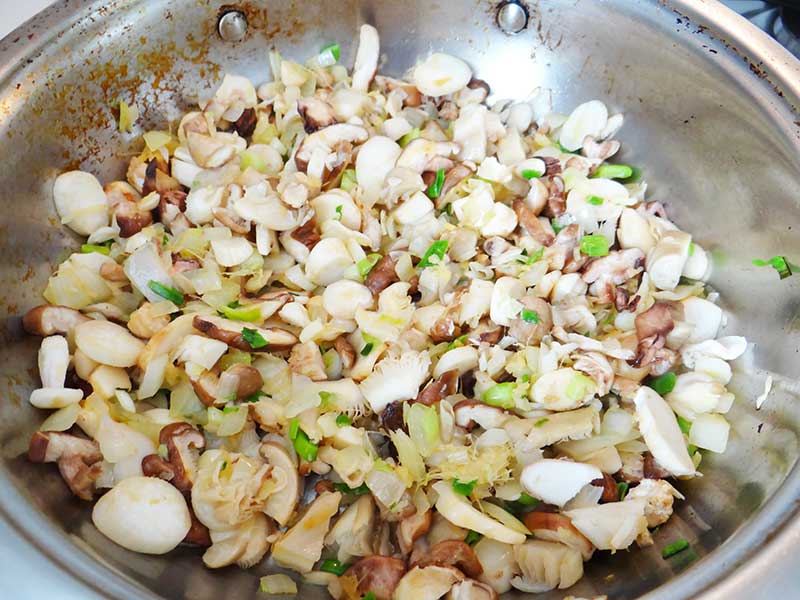 6. Adăugăm ciupercile pe care le călim până devin ușor moi.