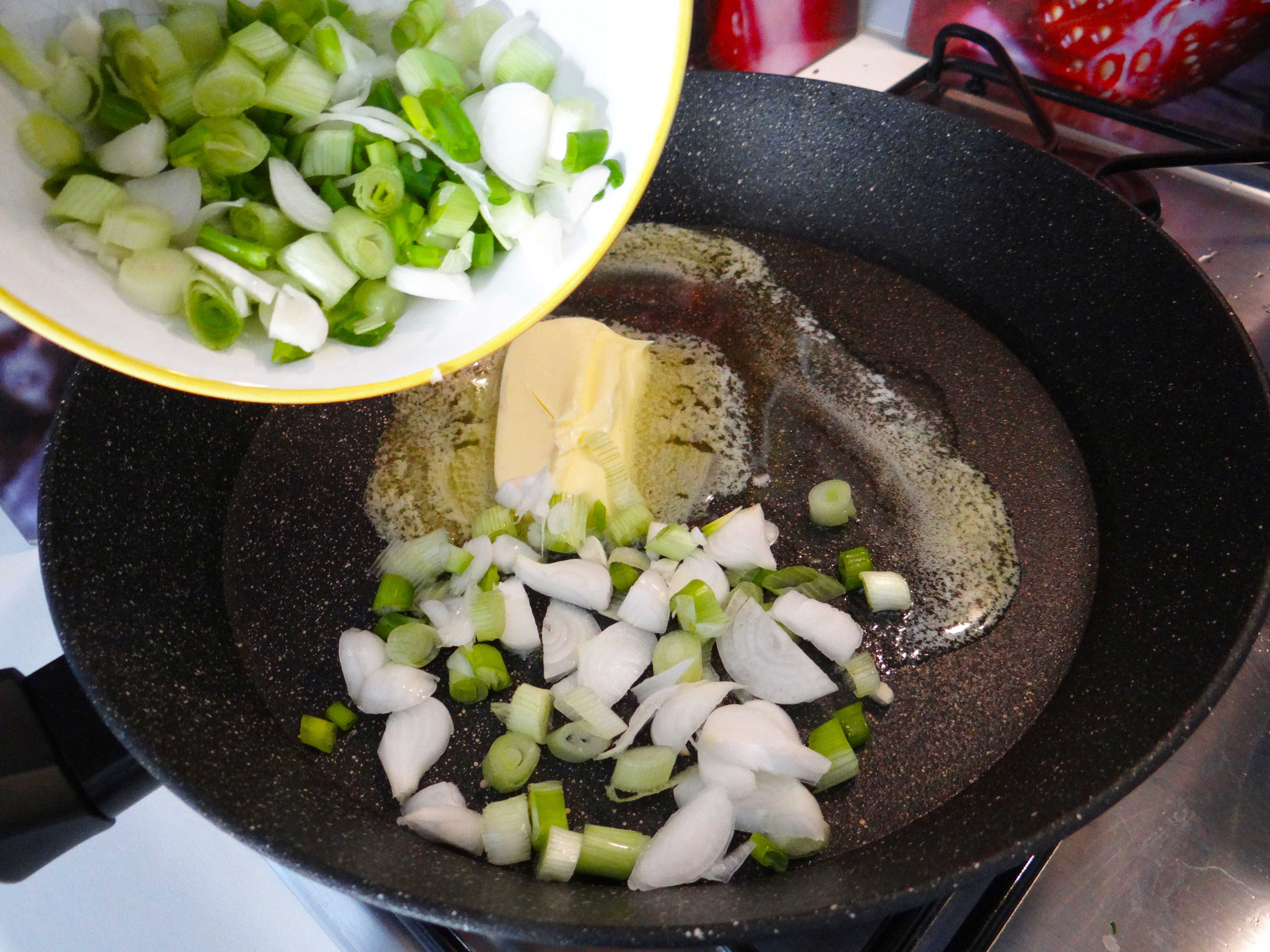3. Punem 50g de unt intr-o tigaie antiaderenta la foc mediu. Cand untul incepe sa se topeasca adaugam ceapa si usturoiul.