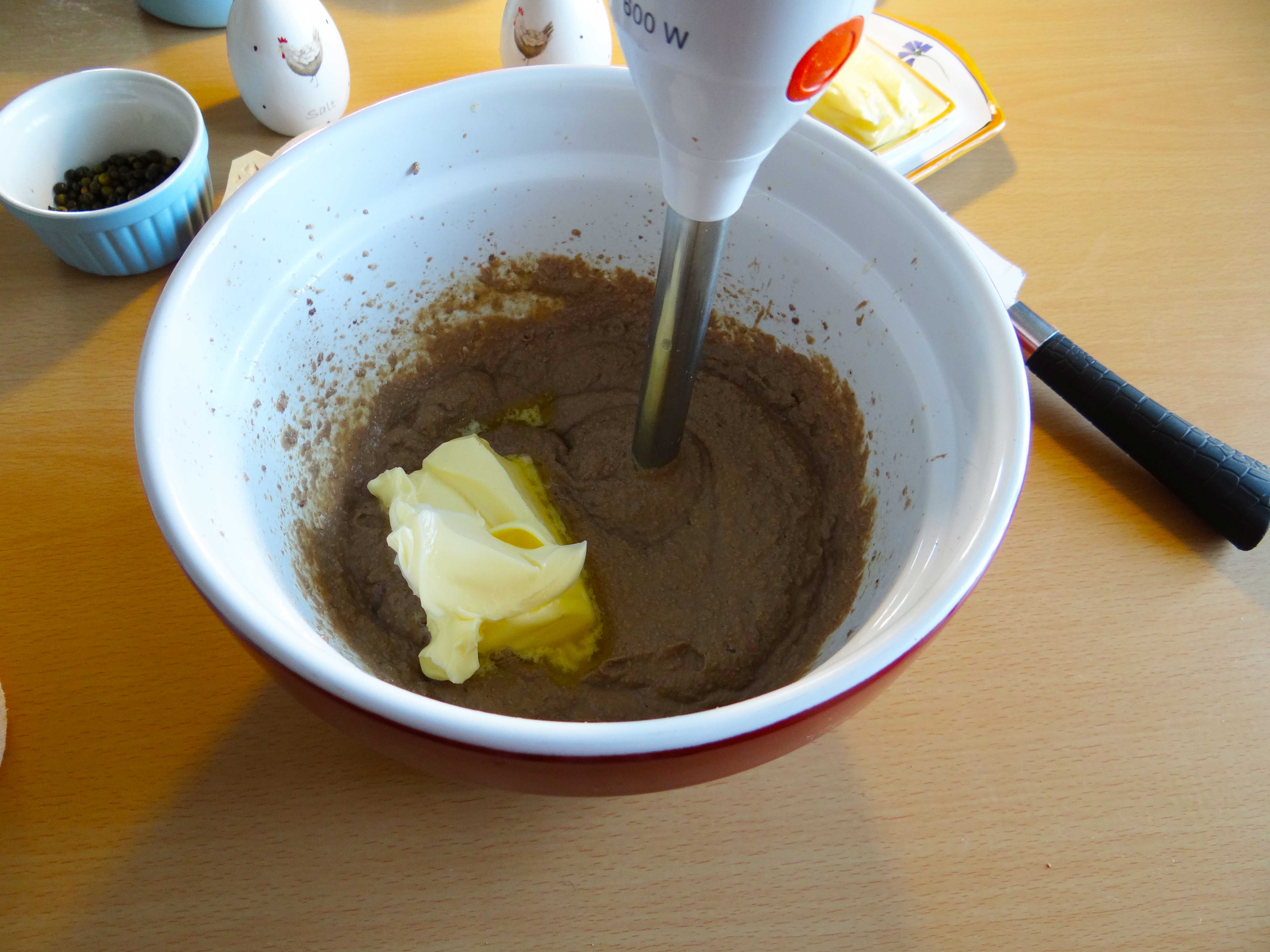 8. Asa arata pateul meu dupa ce am adaugat si untul, s-a deschis la culoare. Sa nu va speriati cand veti observa ca aceasta compozitie este moale, se va intari dupa ce o veti tine la frigider cateva ore.