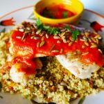 5. Punem pieptul la prăjit într-o tigaie antiaderentă la foc mediu. Îl așezăm cu pielea în jos și îl lăsăm cam 4 minute până când pielea devine maro apoi îl întoarcem și îl mai lăsăm 2 minute. Dupa 2 minute luăm tigaia în care l-am prăjit și o introducem în cuptorul preîncălzit pentru 6 minute. Daca nu aveți tigaie care merge in cuptor faceți ca mine, în momentul în care porniți cuptorul punți și un vas termorezistent să se încalzească si atunci când pieptul este prăjit îl puneți direct in acest vas.