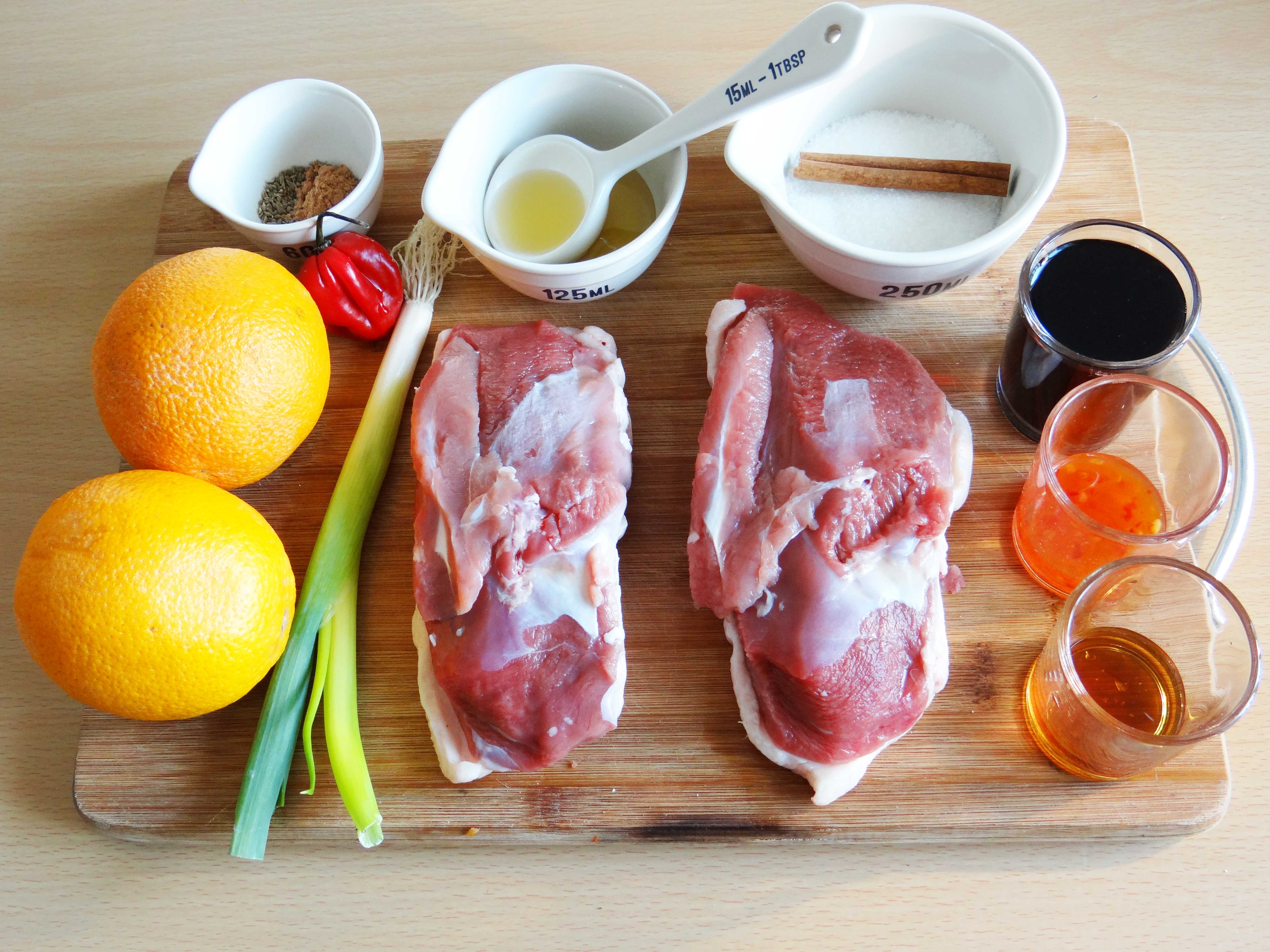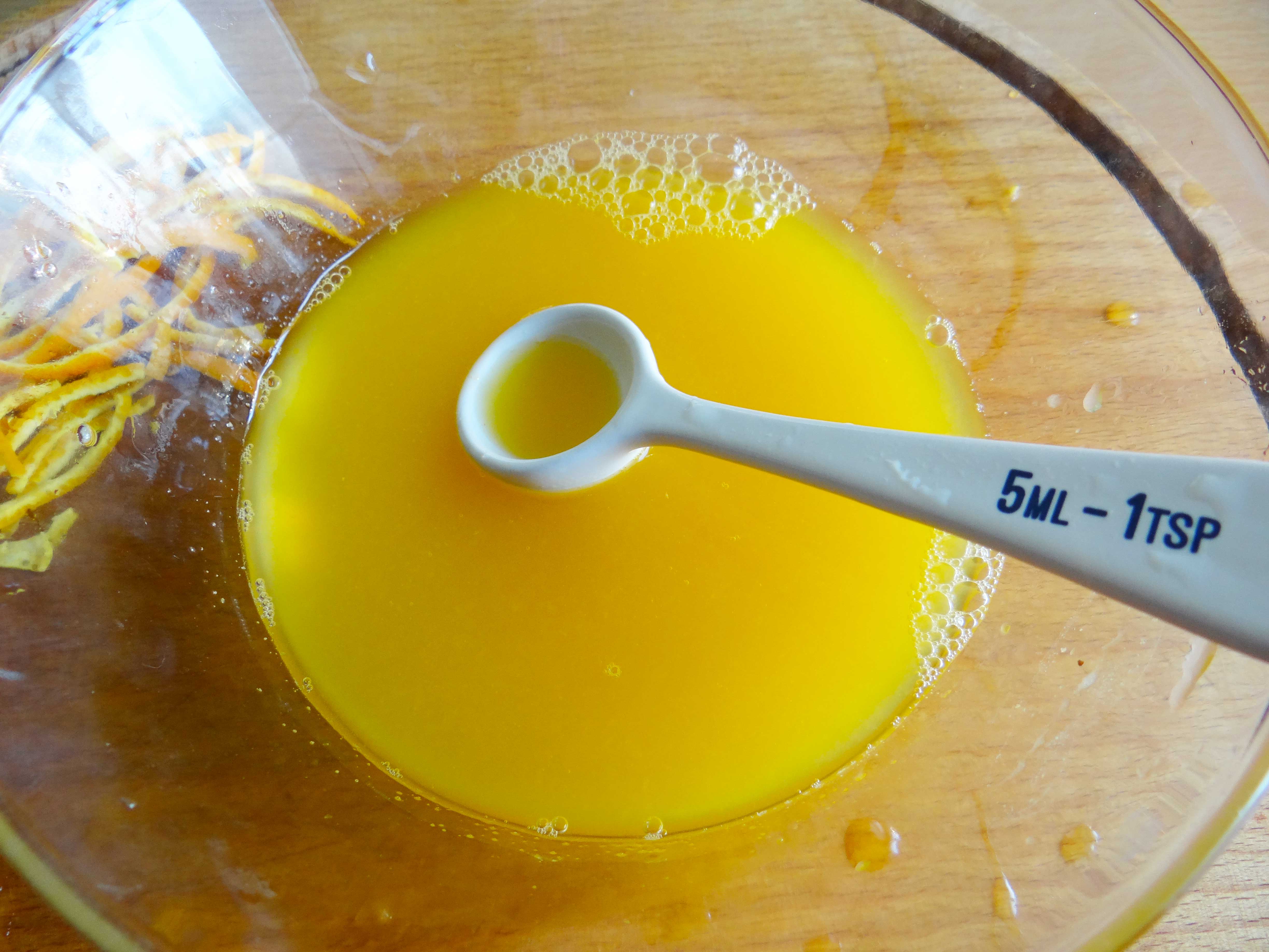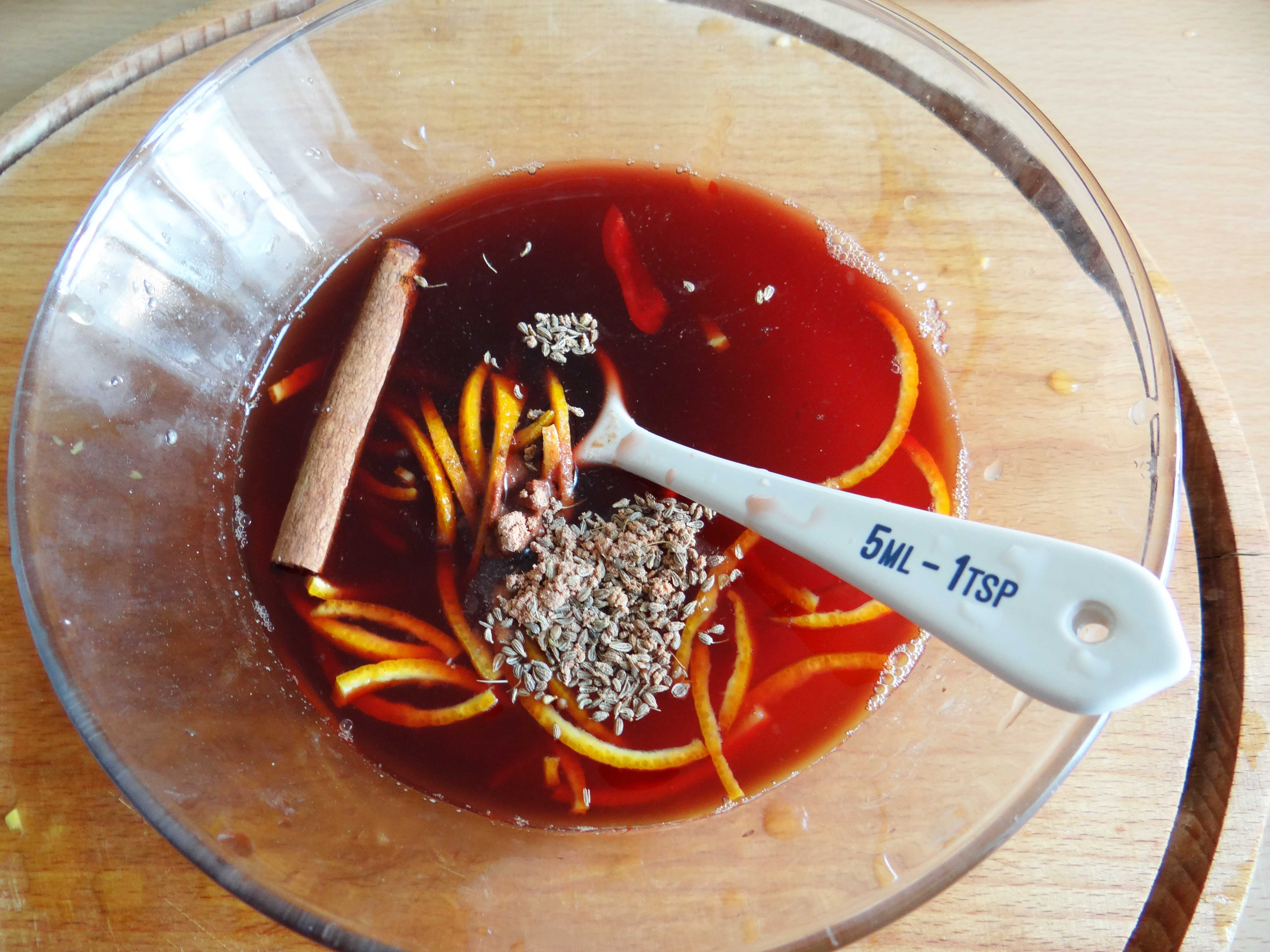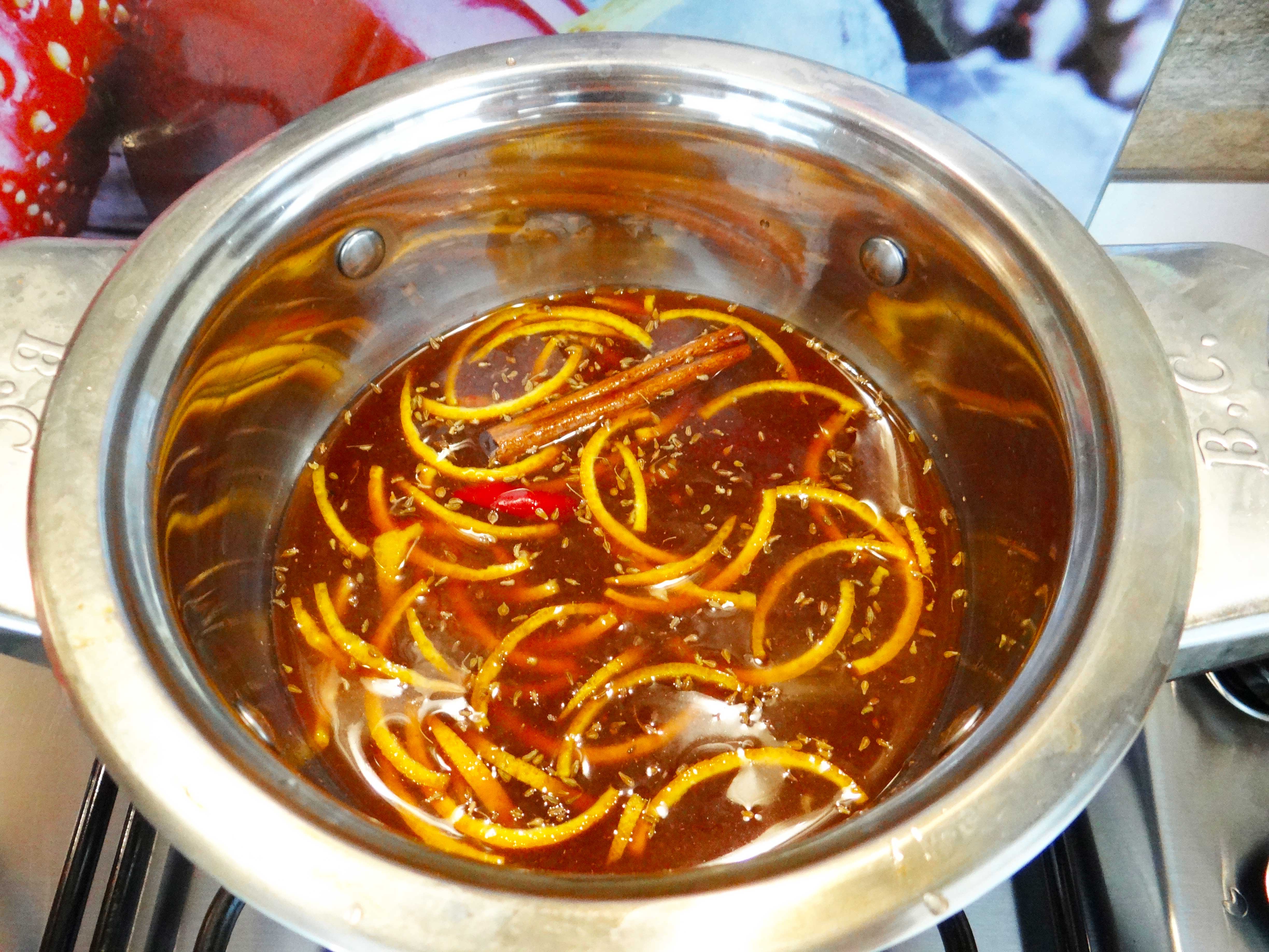 4. Stoarcem cele doua portocale iar sucul obținut îl punem într-un vas. Peste sucul de portocale punem coaja tăiată subțire și restul ingredientelor, adică: zahărul, batonul de scorțișoară, semințele de anason, ghimbirul, vinul, ardeiul iute, sosul de pește, sosul chili. Amestecăm bine și toată compoziția o punem într-o craticioară pe care o așezam pe foc mic și o lăsăm să fiarbă până când capătă o consistență asemănătoare cu a unui sirop.
