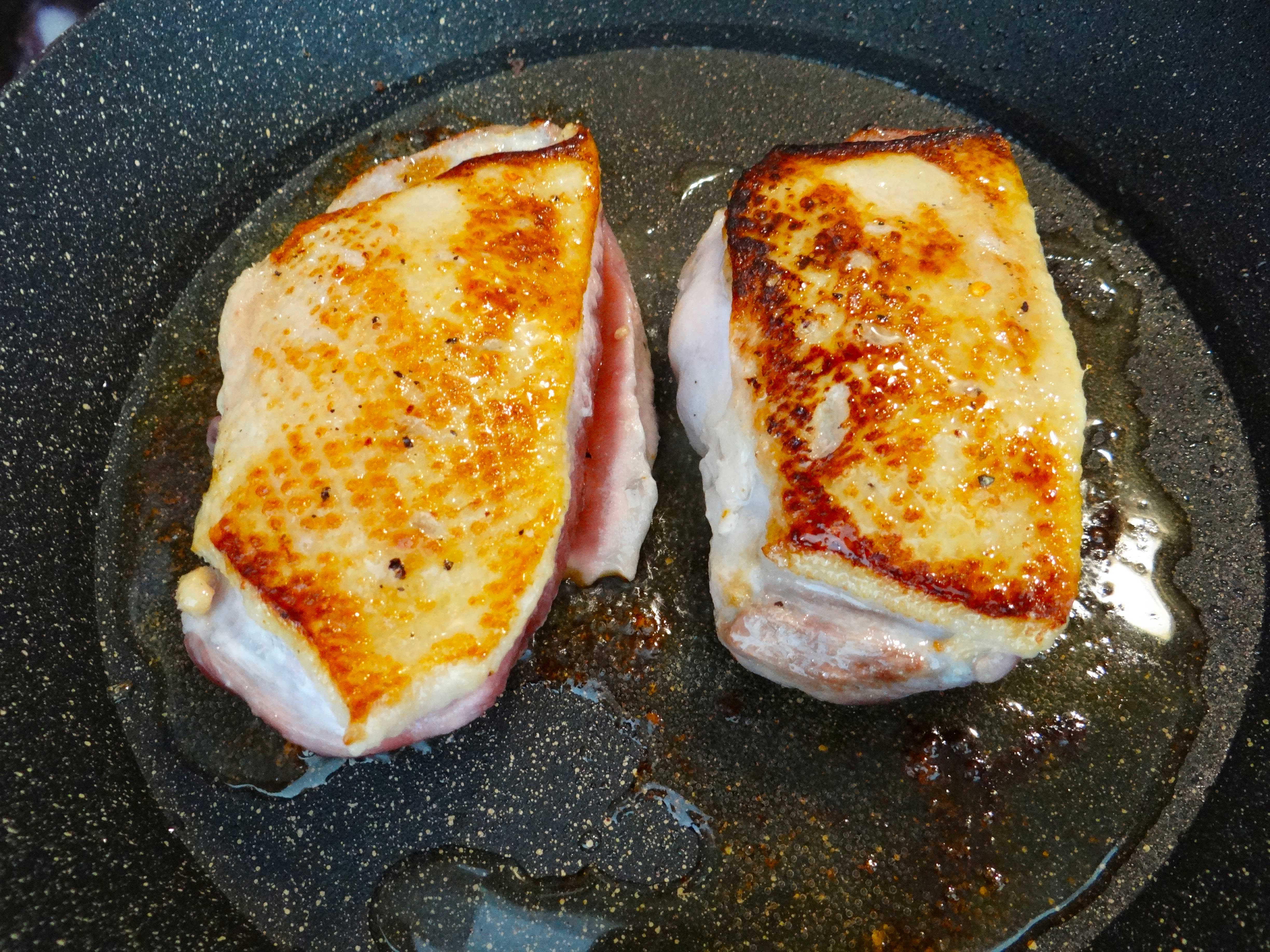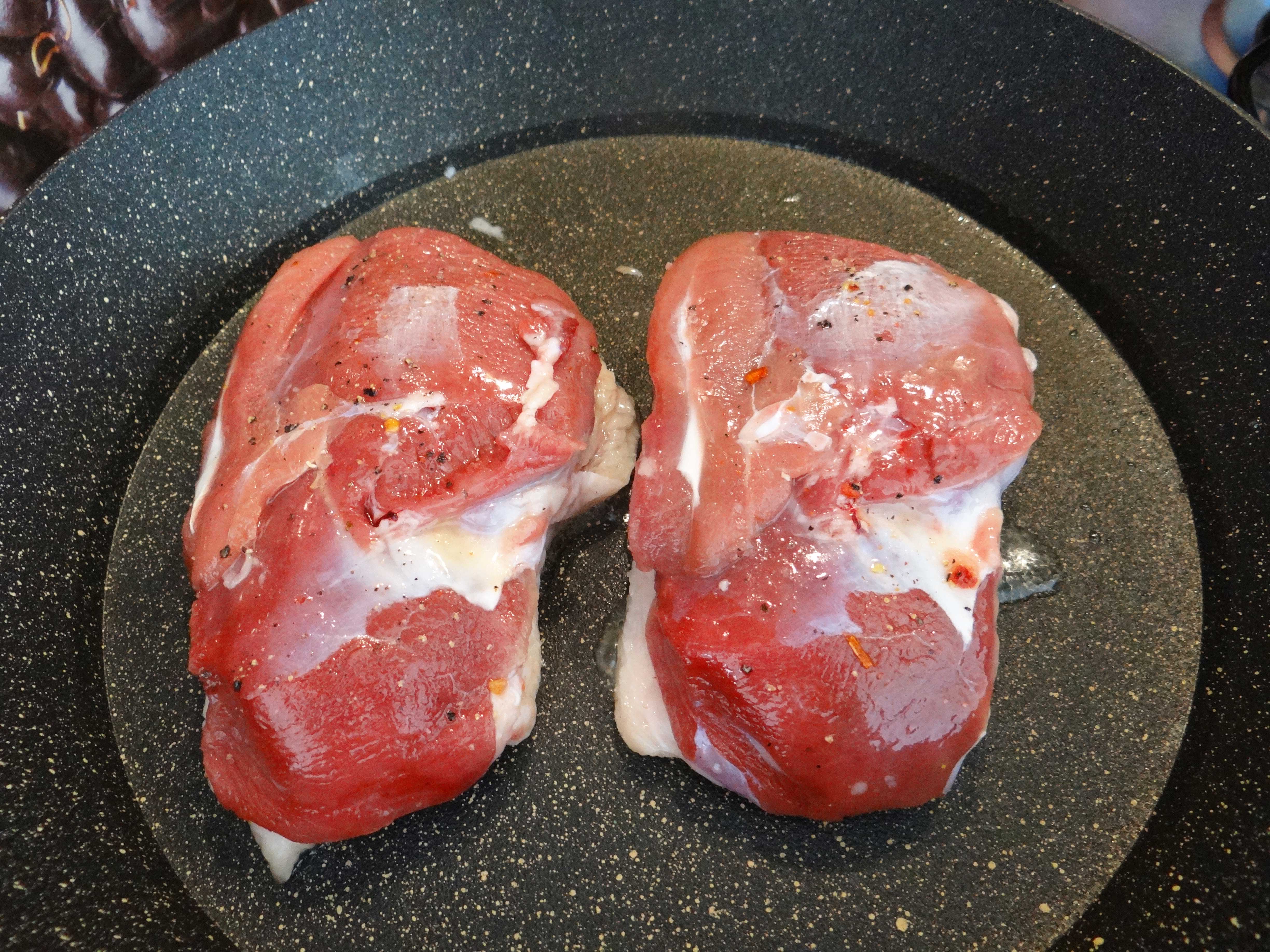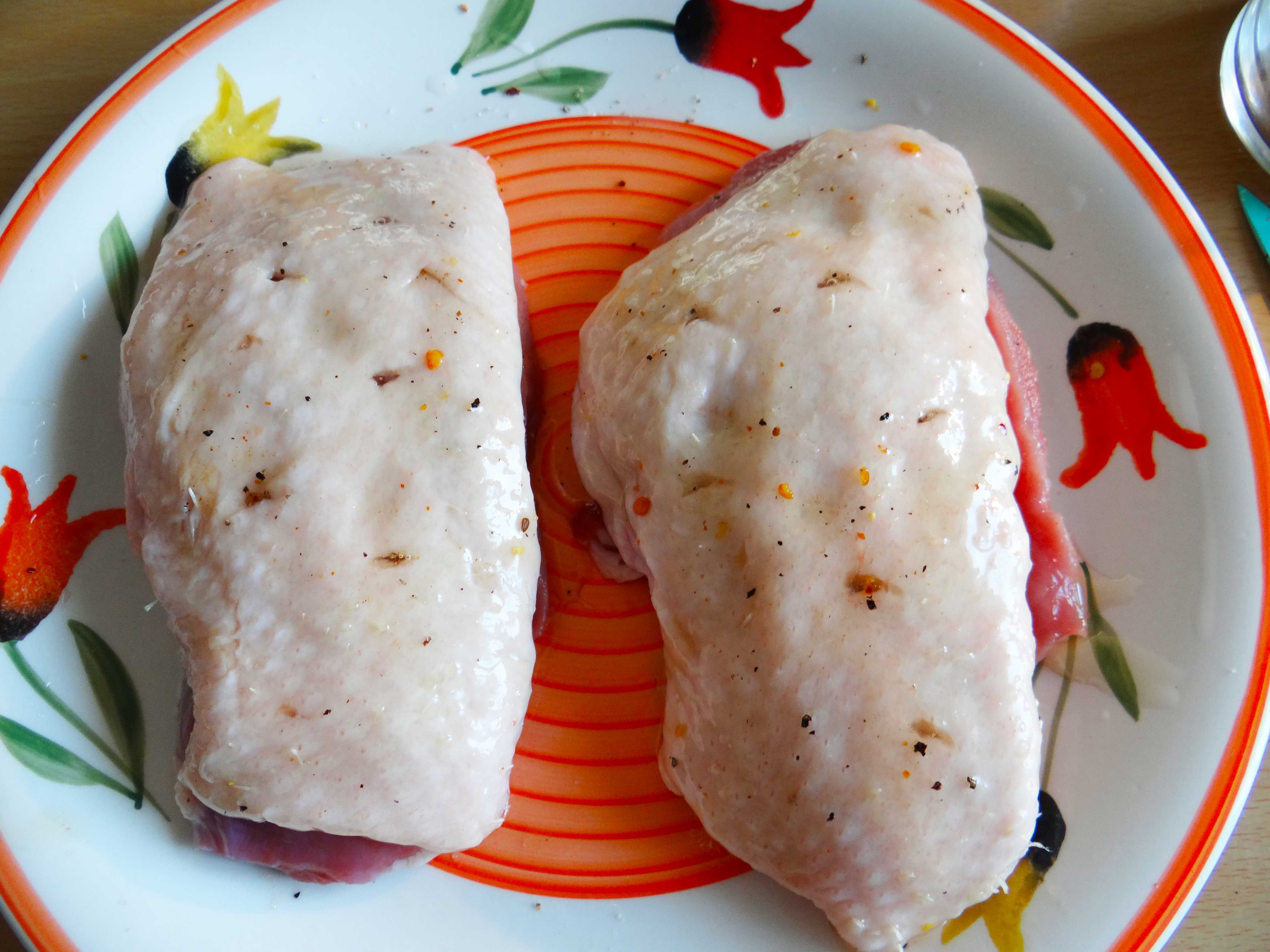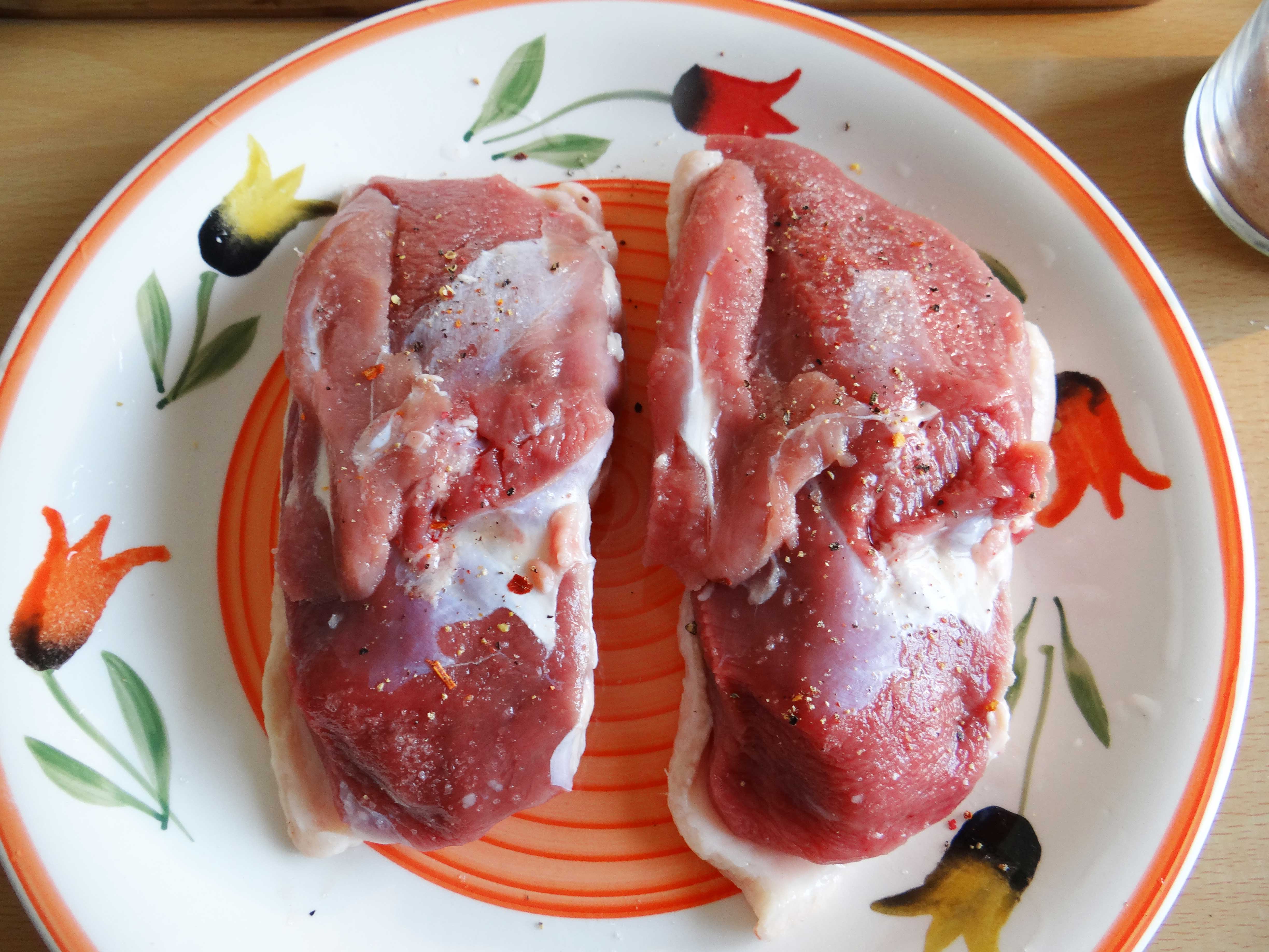1. Preâncălzim cuptorul la 220 C. Sărăm și piperăm pieptul de rață.