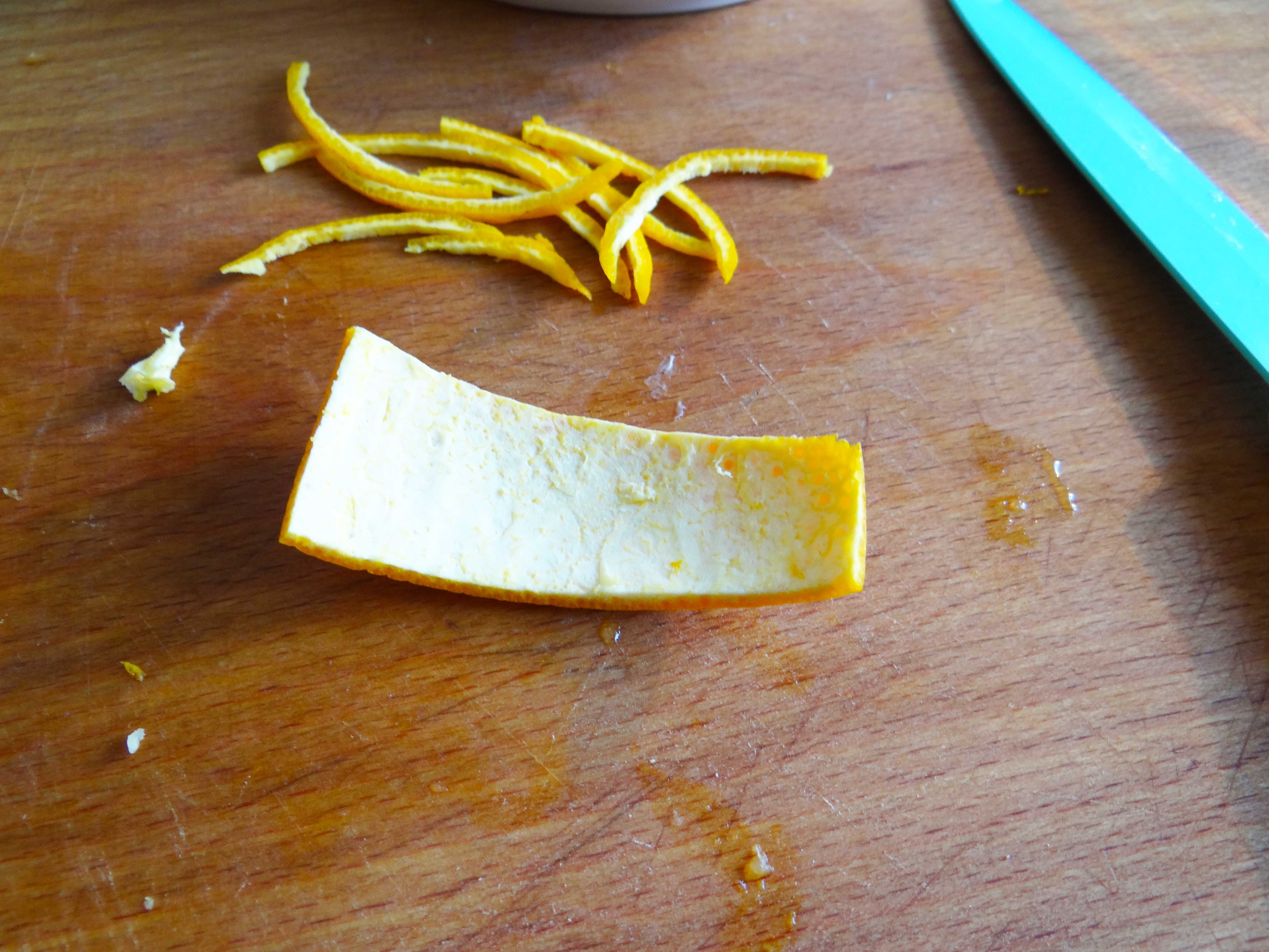 3. Lăsăm pieptul de-o parte și ne ocupăm de sosul de portocale. Tăiem coaja de pe o jumatate de portocală, îndepărtăm partea alba cât de mult putem. Vom avea nevoie de un cuțit bine ascuțit. Apoi tăiem coaja în bucăți foarte subțiri.