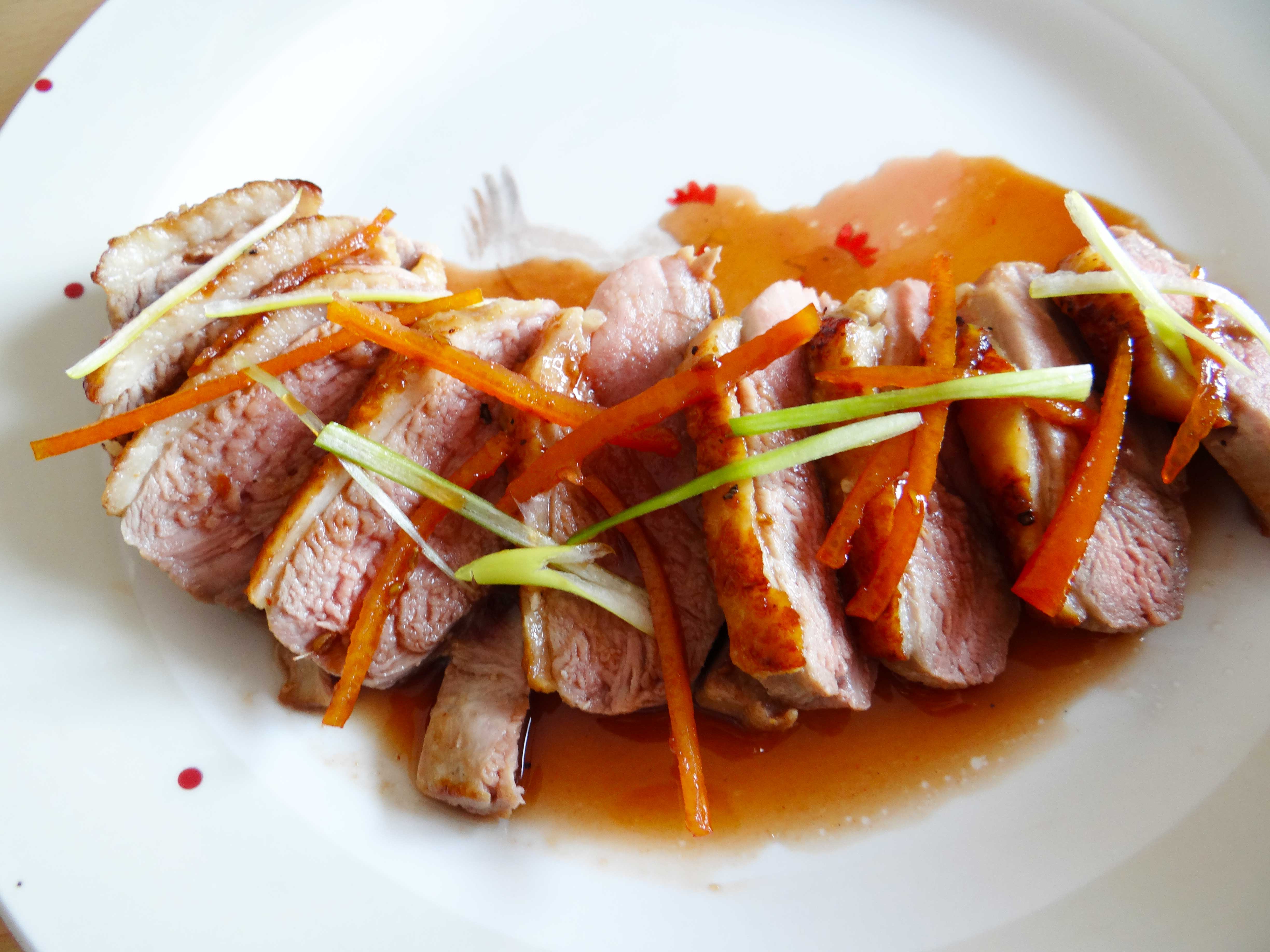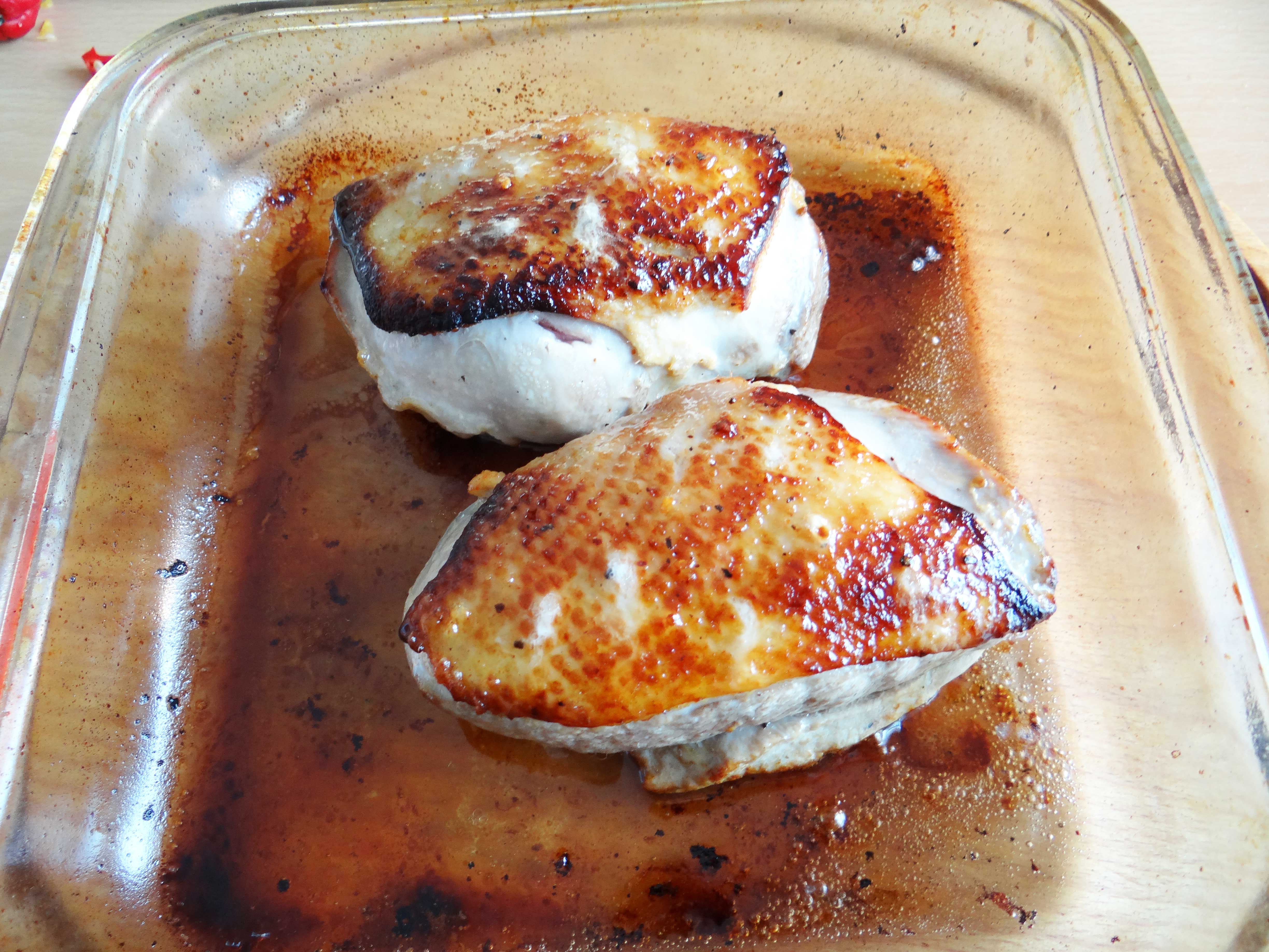 Așa arată pieptul meu după ce l-am tăiat. Este suculent iar la mijloc este roz. Deasupra am pus sosul de portocale și fâșii de coajă de portocale și ceapă verde.