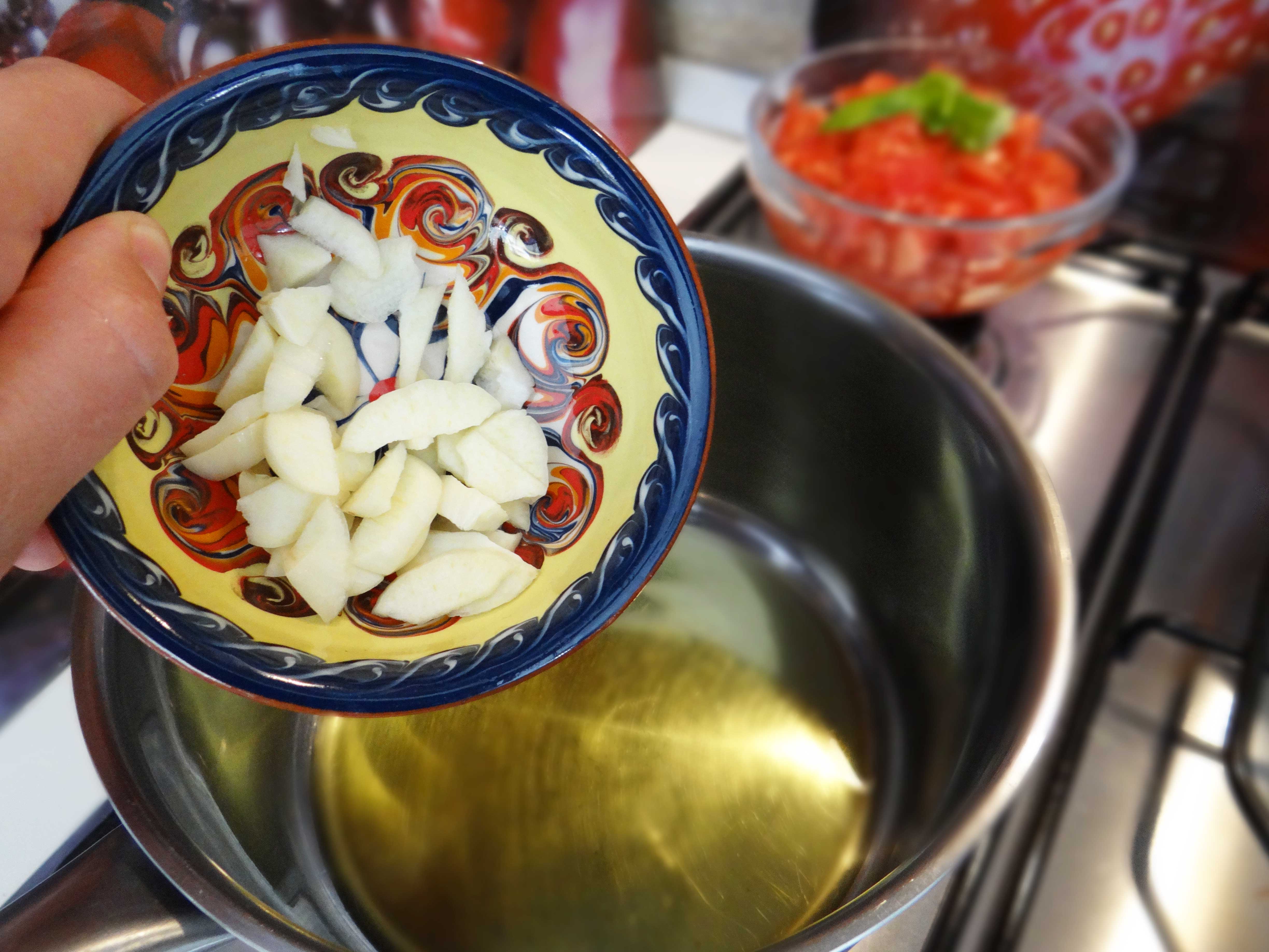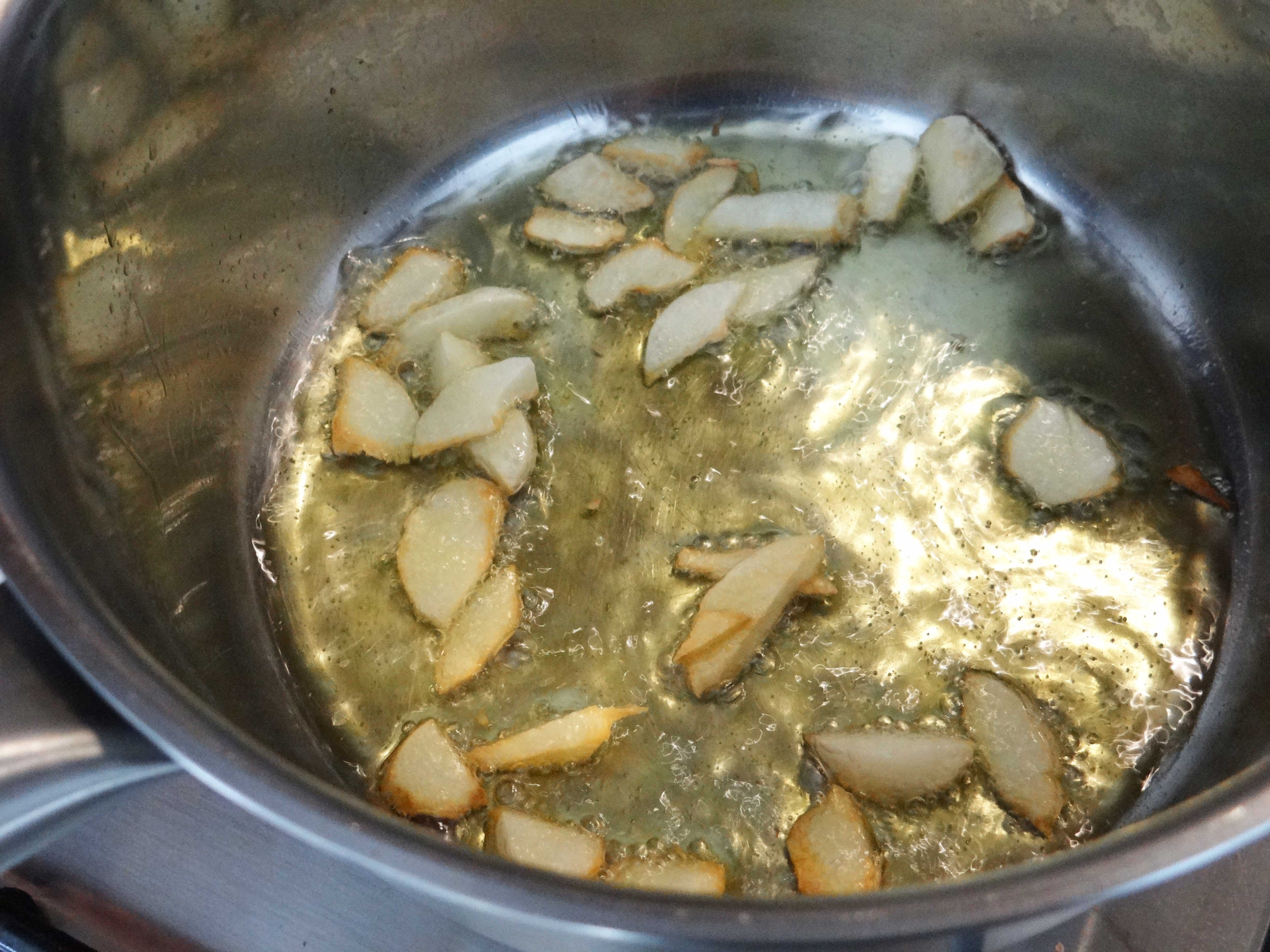 3. Punem uleiul la incins intr-o craticioara dupa care adaugam usturoiul. Lasam usturoiul pe foc cam un minut pana incepe sa se maroneasca usor.