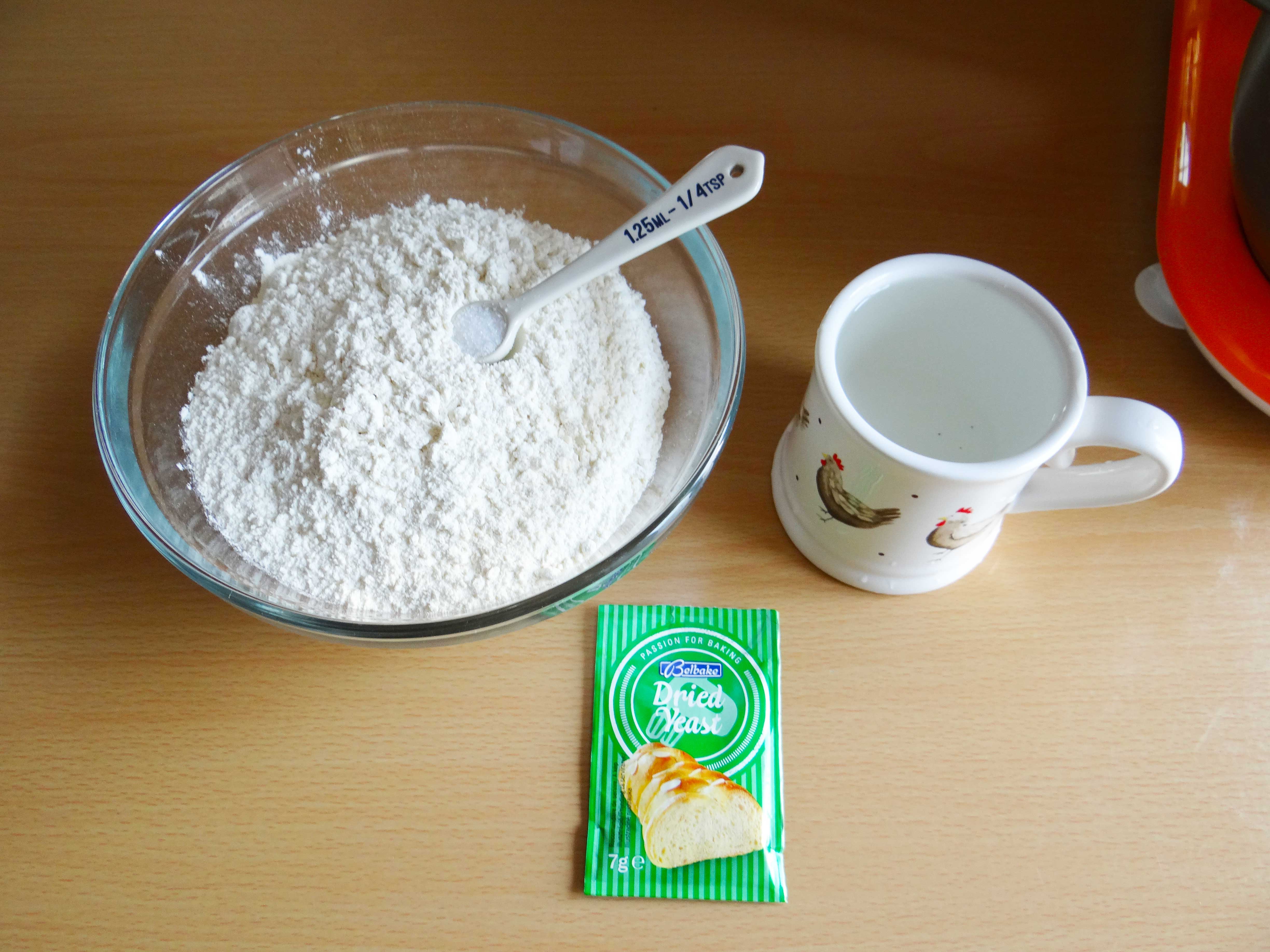 1. Punem faina si sarea in bolul unui robot de bucatarie si mixam 10 secunde pentru a oxigena faina.