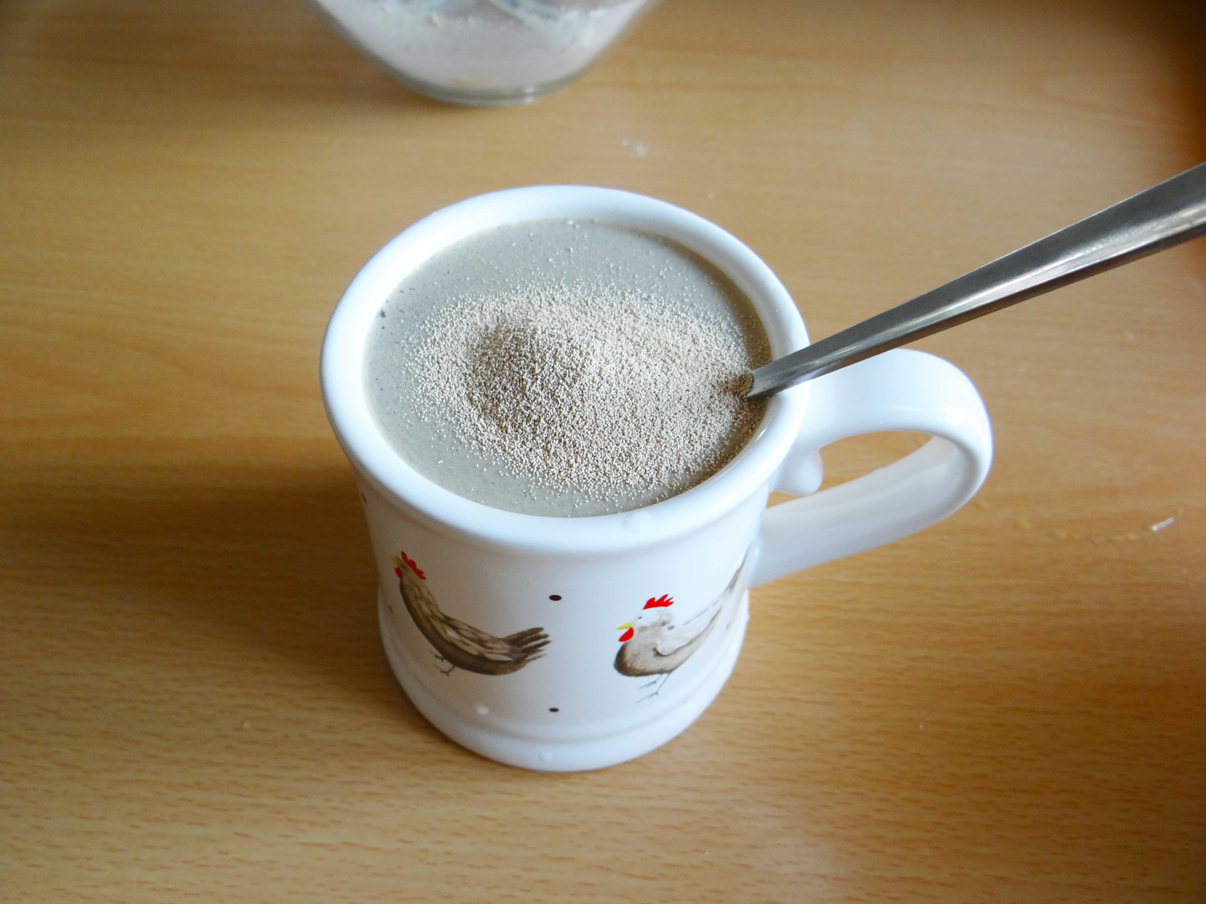 2. In cana cu apa calduta punem drojdia uscata si amestecam bine. Apoi turnam acest amestec peste faina.