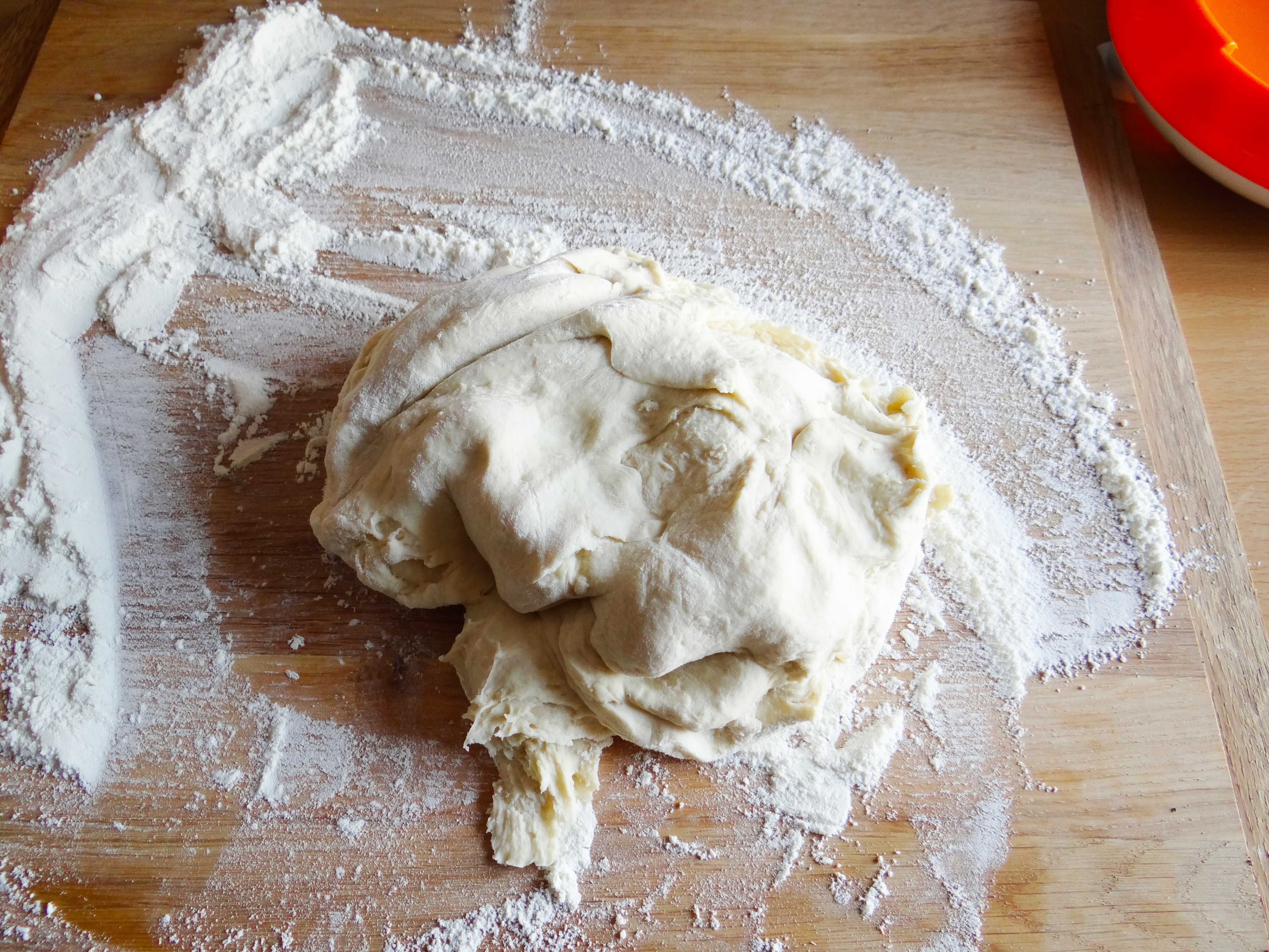3. Pornim robotul de bucatarie si framantam la viteza mare aluatul. Eu l-am framantat vreo 5 minute dupa care l-am pus pe masa de lucru infainata si l-am mai framantat cu mana inca 5 minute, pana cand a devenit elastic.