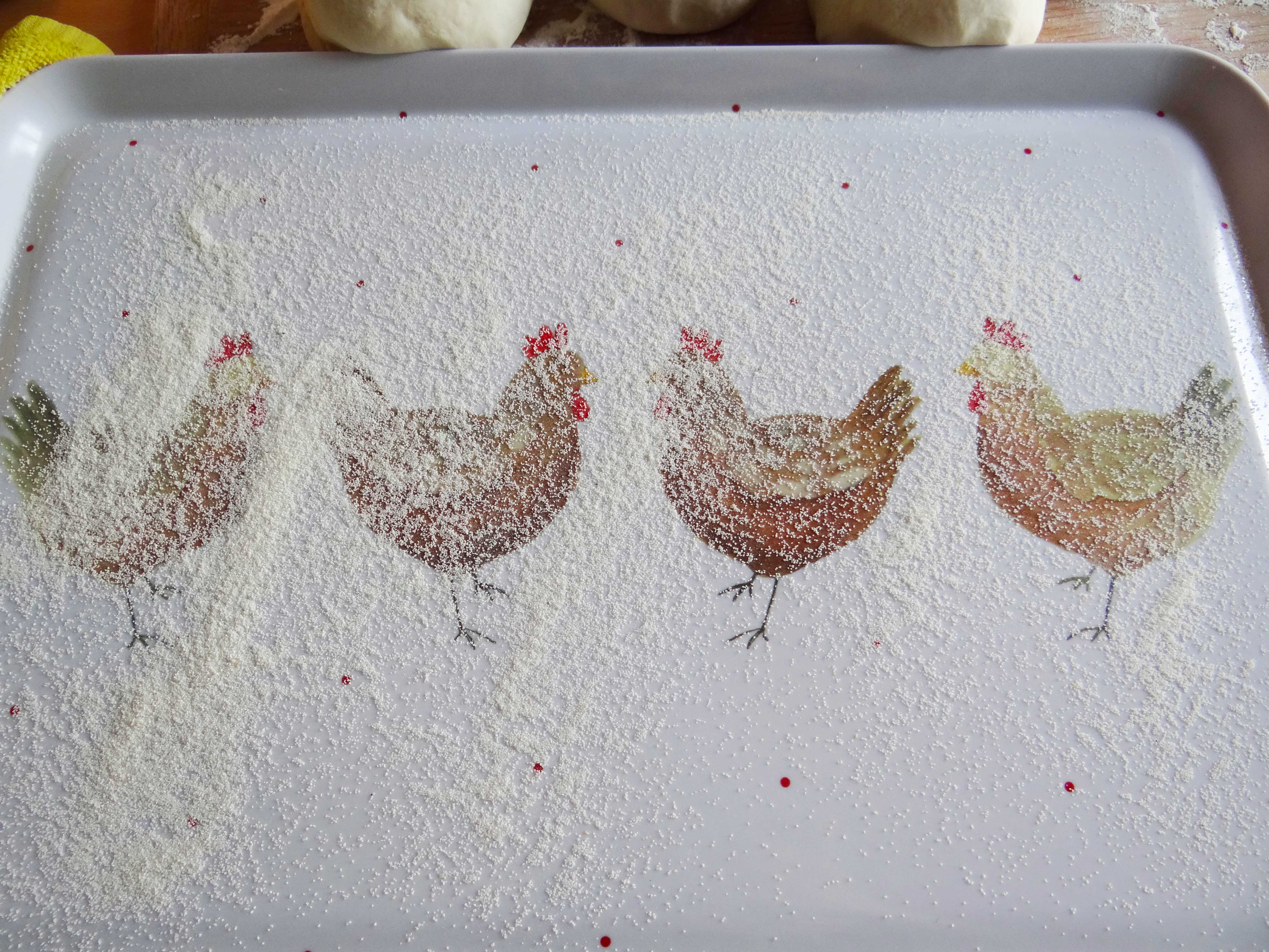 6. Deasupra fiecarei bile de aluat presaram faina apoi acoperim tava cu folie alimentara si o lasam la loc caldut cam 2 ore.
