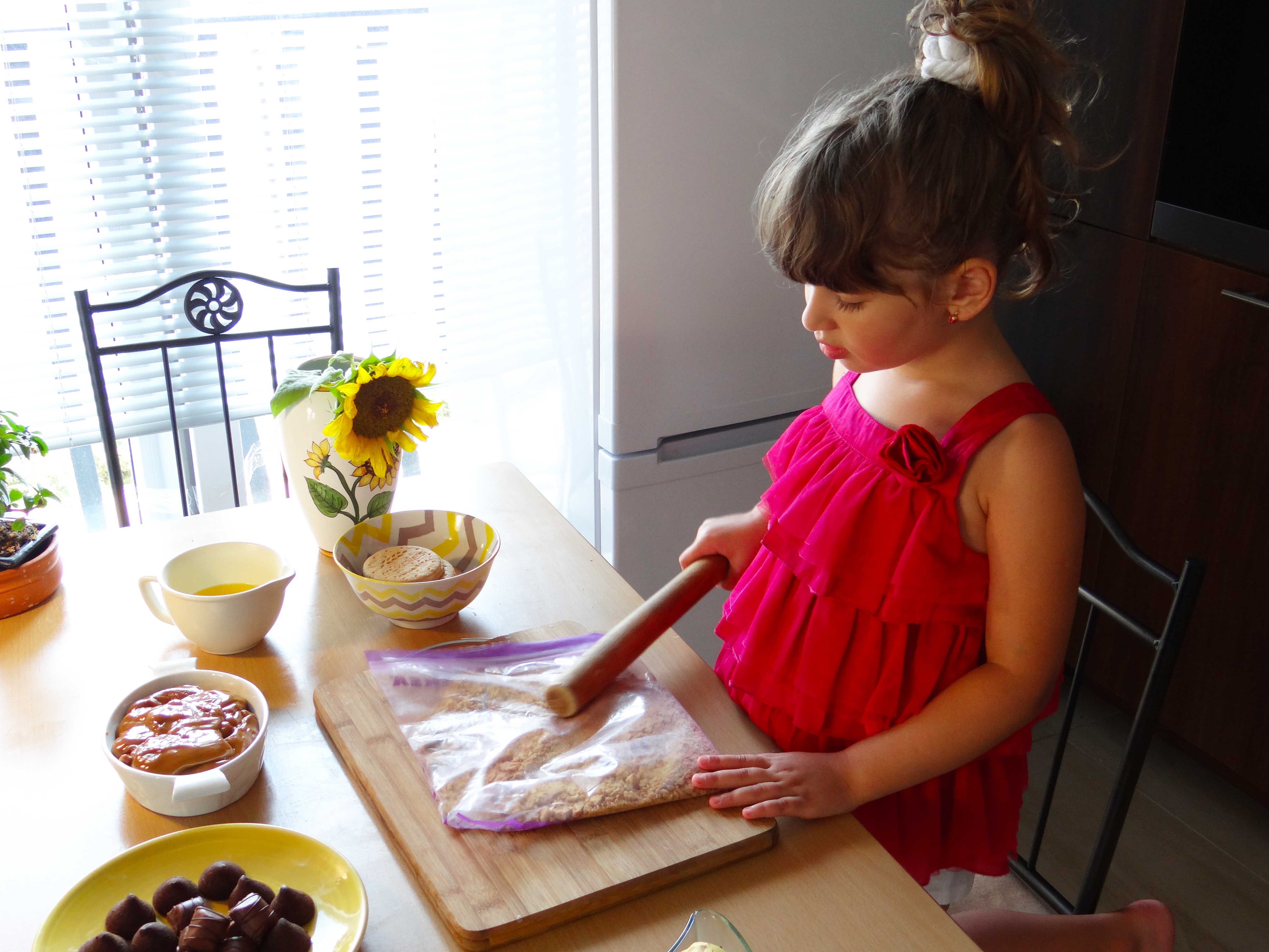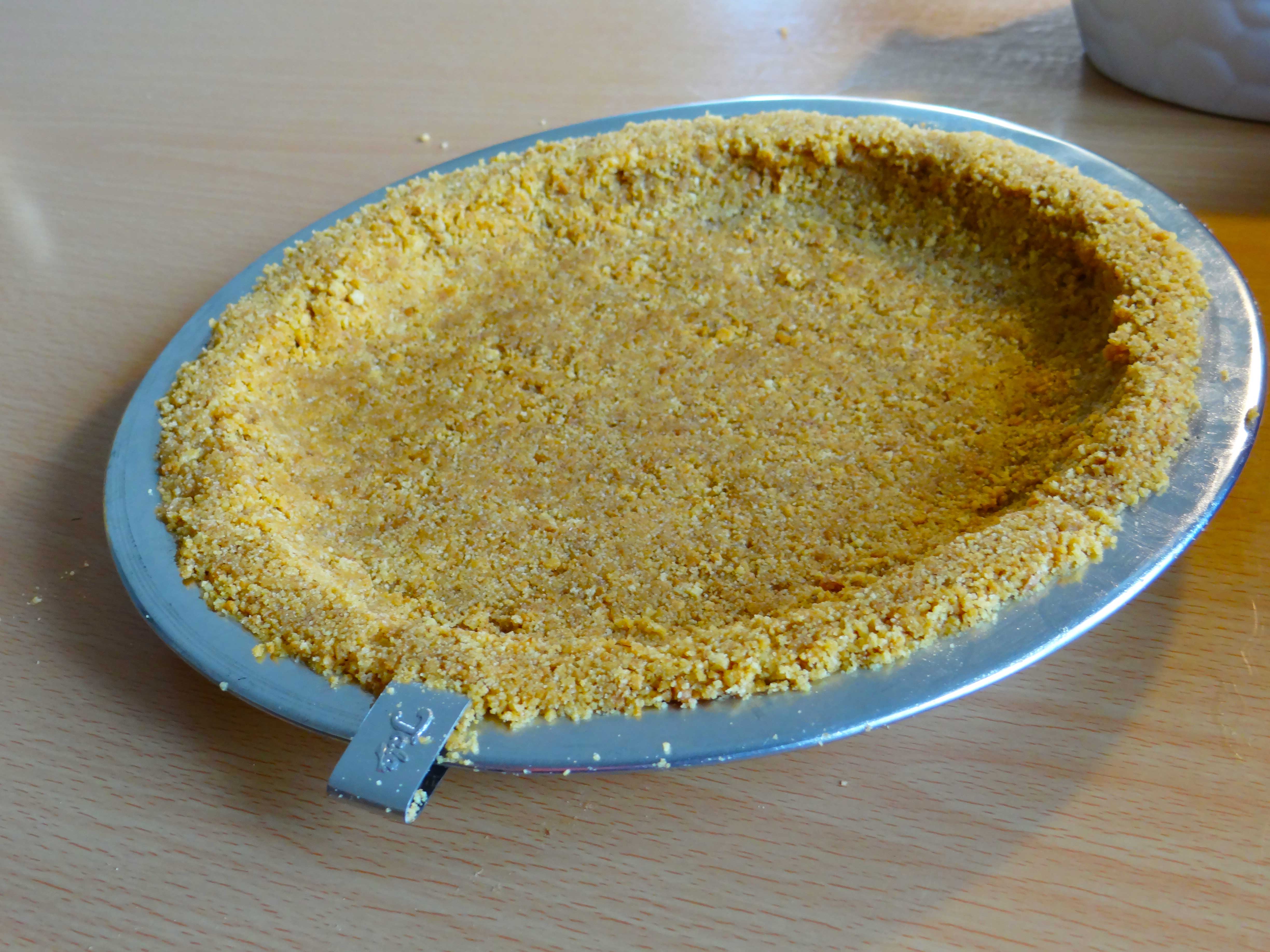 Presam bine buscuitii pentru a forma o crusta uniforma, eu am folosit o cutie de plastic. Dupa ce am format crusta dam tava la frigider pentru 20 de minute.