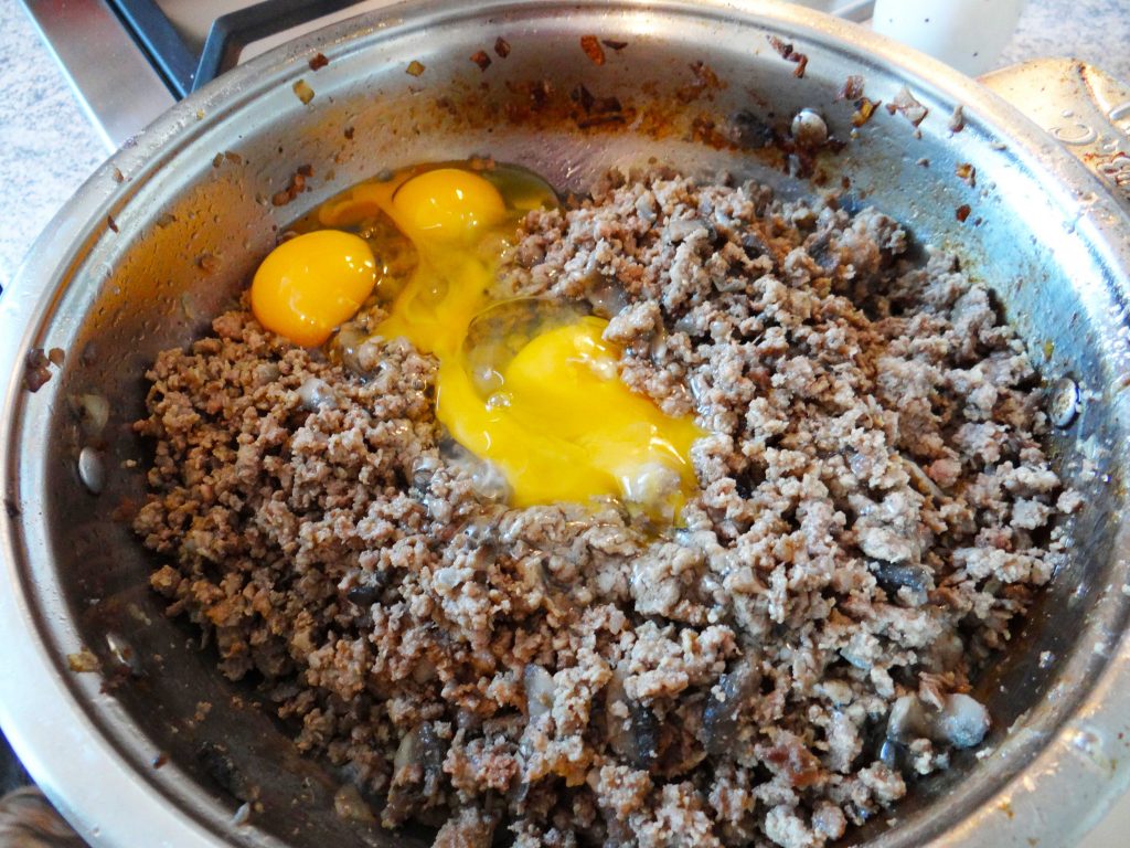 5. Lăsăm carnea să se răcească după care adăugăm cele 4 ouă și apoi amestecam totul bine.