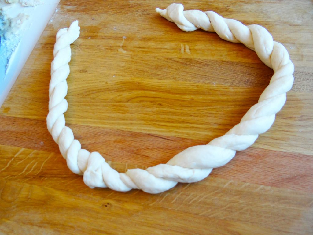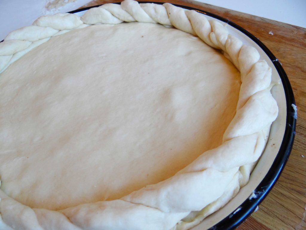11. Din aluatul care ne-a rămas facem două rulouri pe care le împletim și le așezăm pe marginea tăvii.