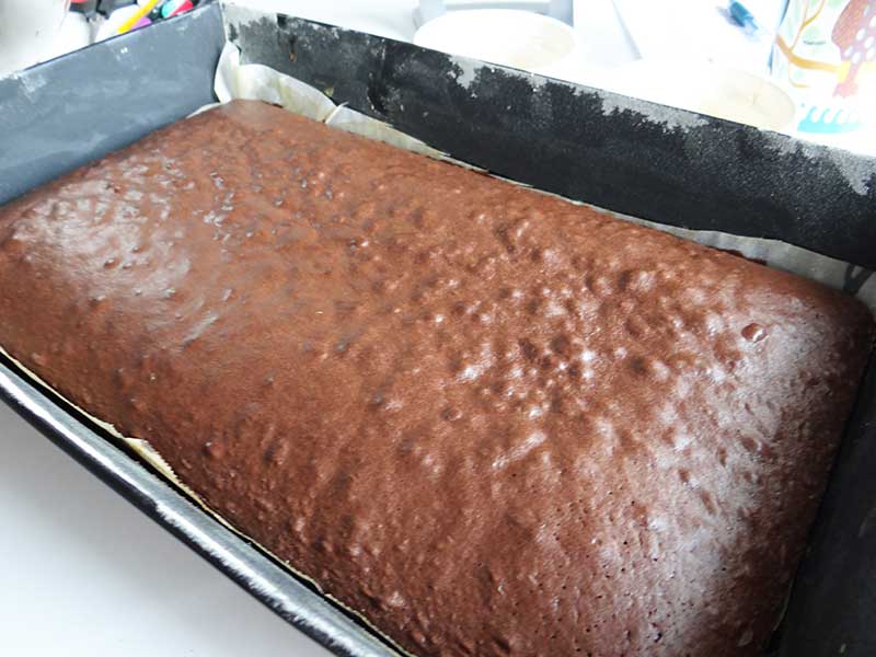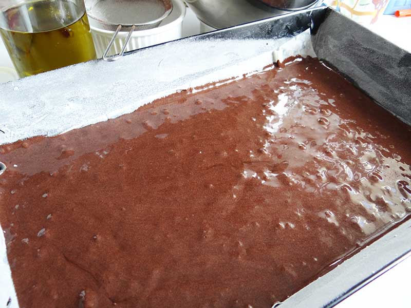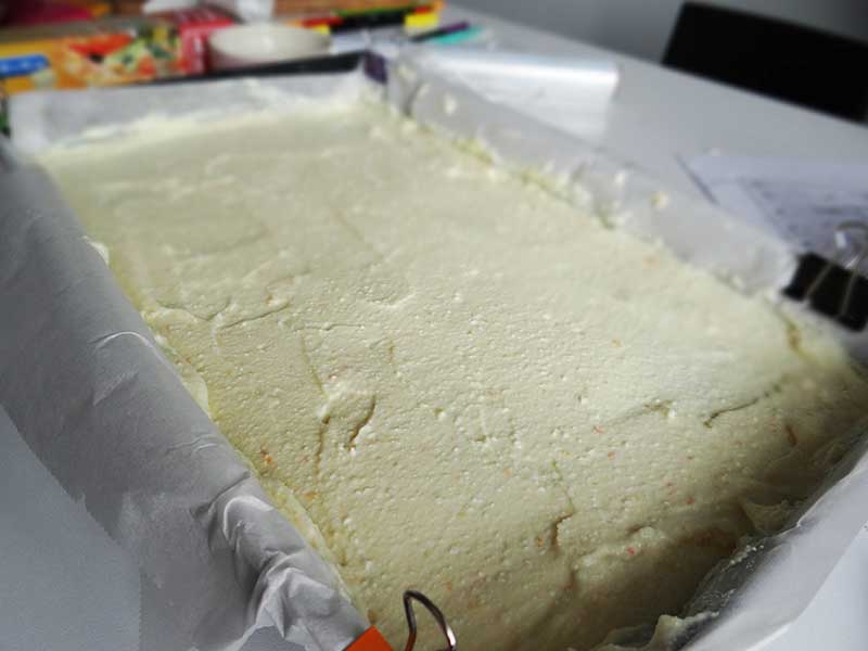 3. Turnăm amestecul pentru blat într-o tavă cu dimensiunea de aproximativ 20X37cm. Tava trebuie unsă în prealabil cu unt și tapetată cu făină. Eu am folosit și o bucată de hârtie de copt.