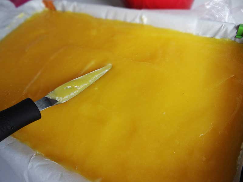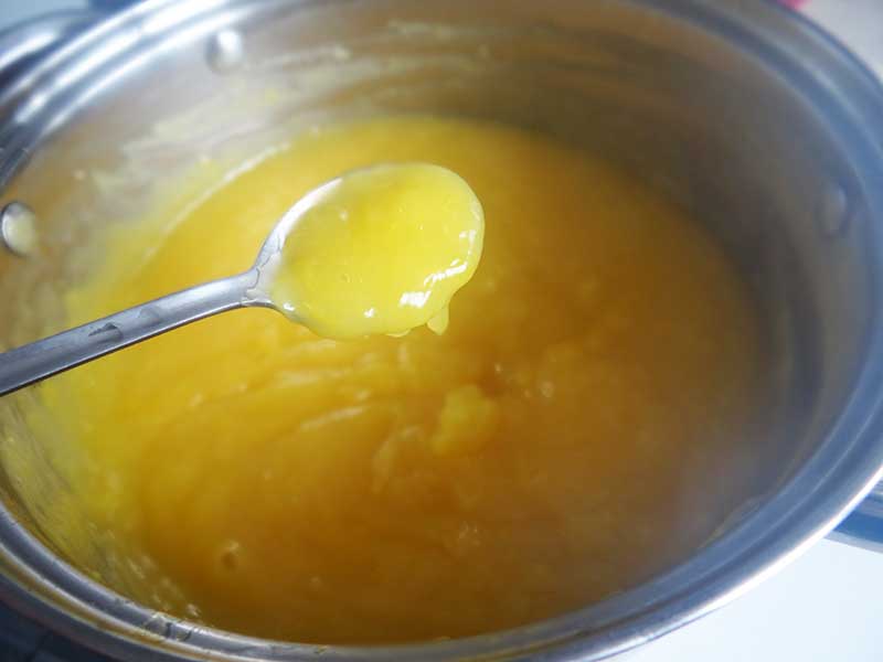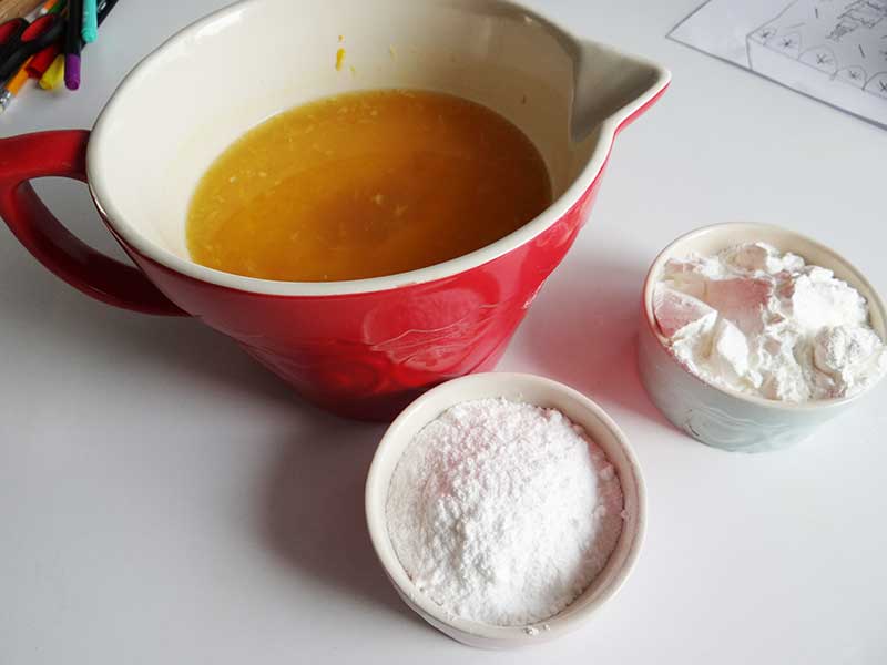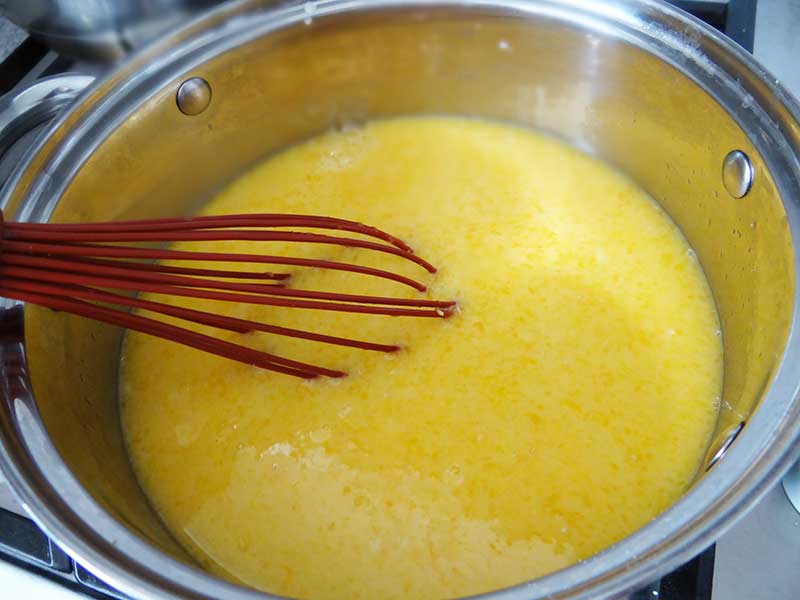 4. Cât timp se răcește blatul pregătim jeleul de portocale. Punem sucul de portocale la fiert, separat dizolvăm amidonul și zahărul într-o jumătate de cană de suc de portocale(din cantitatea totală) după care turnăm amestecul în oala cu suc de portocale. Amestcăm continuu până când amestecul capătă consistența unei budinci.