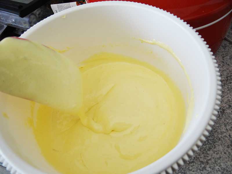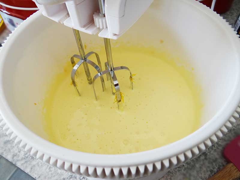 3. Punem ouăle în bolul unui mixer după care le mixăm la viteză mare până când acestea devin spumoase. Adăugăm zahărul, zahărul vanilat și coaja răzuită de lămâie. Mixăm 1 minut la viteză mică și 2 minute la viteză mare.